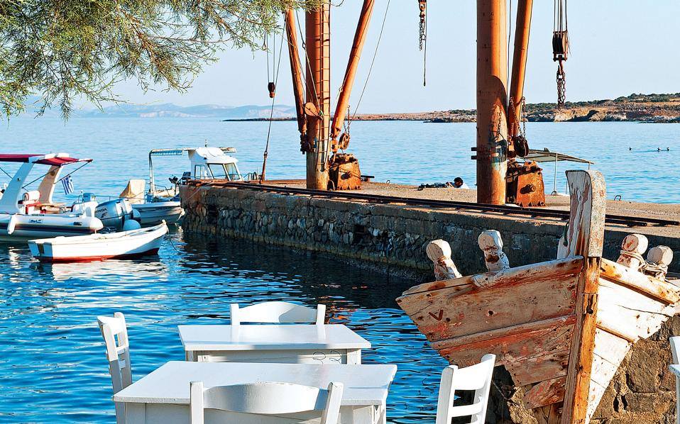 Arriving in Moutsouna, leave the car at the parking area and stroll down to the waterfront. The cranes and hoists that once lifted blocks of emery onto waiting ships now stand rusted against the brilliance of the Aegean, reminders of another era.