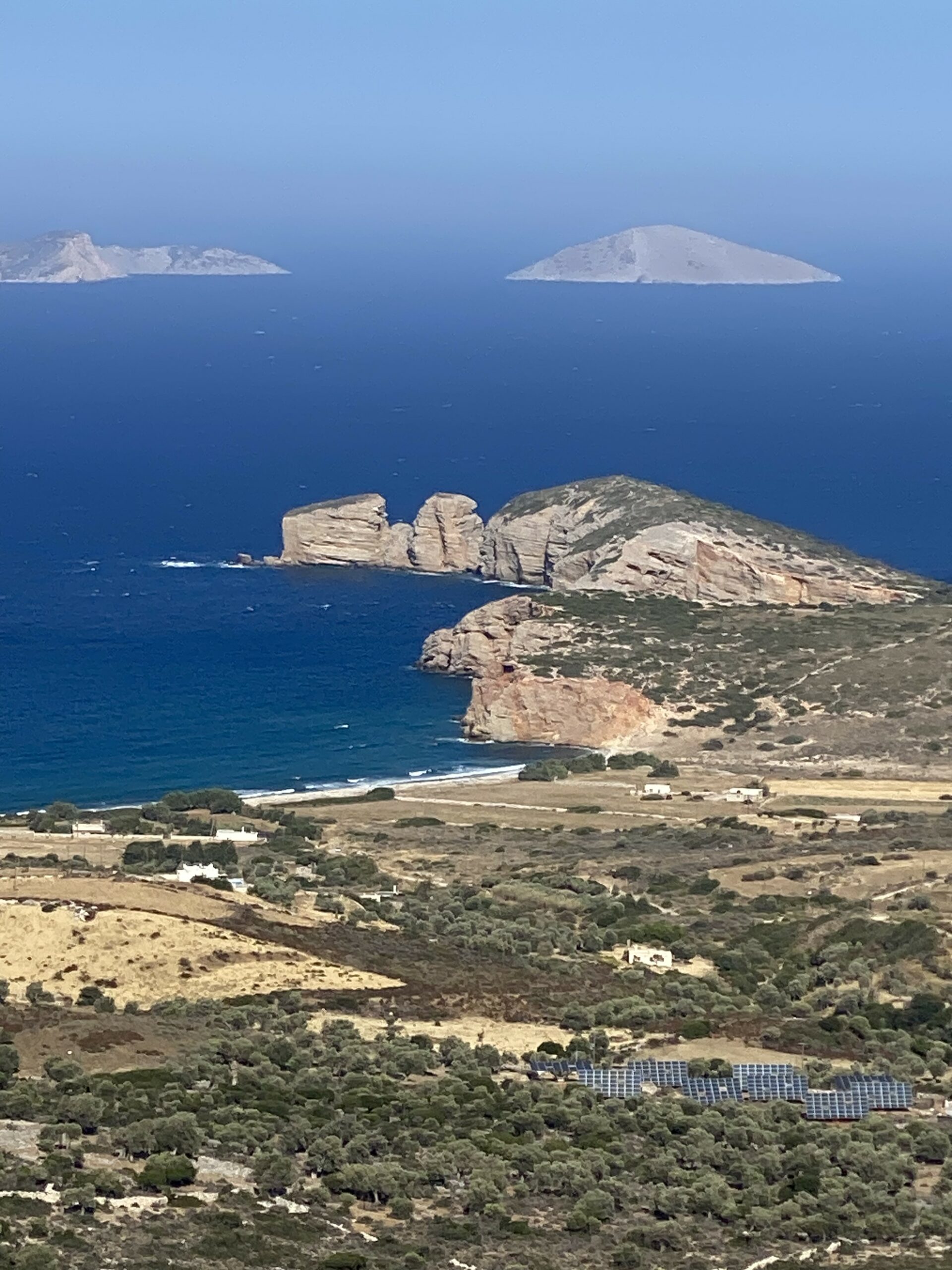 Further along, the road delivers one of the most striking viewpoints in the Aegean. The sculpted cliffs of the Moutsouna peninsula dominate the foreground, framed by the tiny islets of the Makares and the silhouette of Donousa. To the right, Koufonisia, proud Keros, and the gentle outline of Amorgos complete the horizon. It feels like standing on a balcony overlooking an intimate neighborhood of islands, all so close yet each enveloped in its own rich mythology.