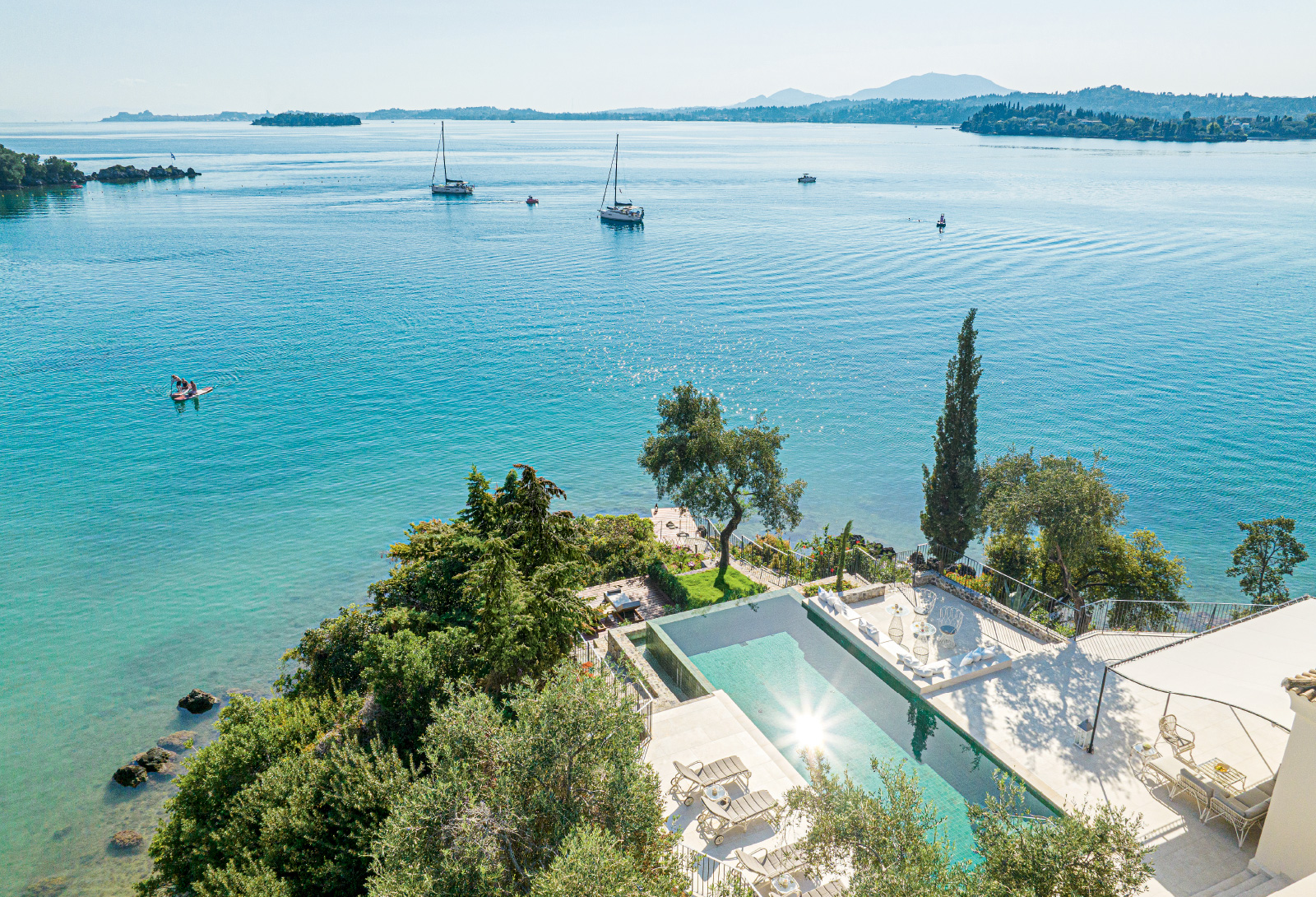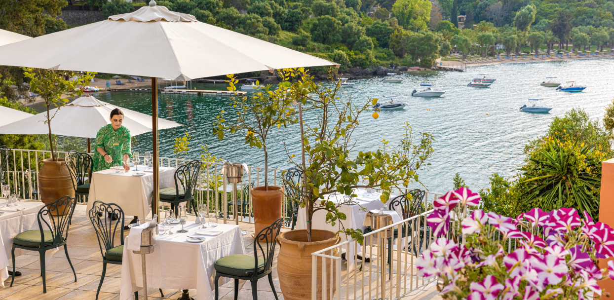 Eva Palace by Grecotel also enjoys the privileged location of Kommeno and the fascinating view of the Ionian. Its beautiful shoreline exudes a belle epoque feeling, rivaled by a giant pool hidden within lush gardens with integrated palm trees. Like an enviable, majestic boutique hotel nestled among olive trees and cypresses, it gives the feeling of being far away, cut off from everyone and everything, despite being just a 10-minute distance from Corfu’s picturesque old town.
