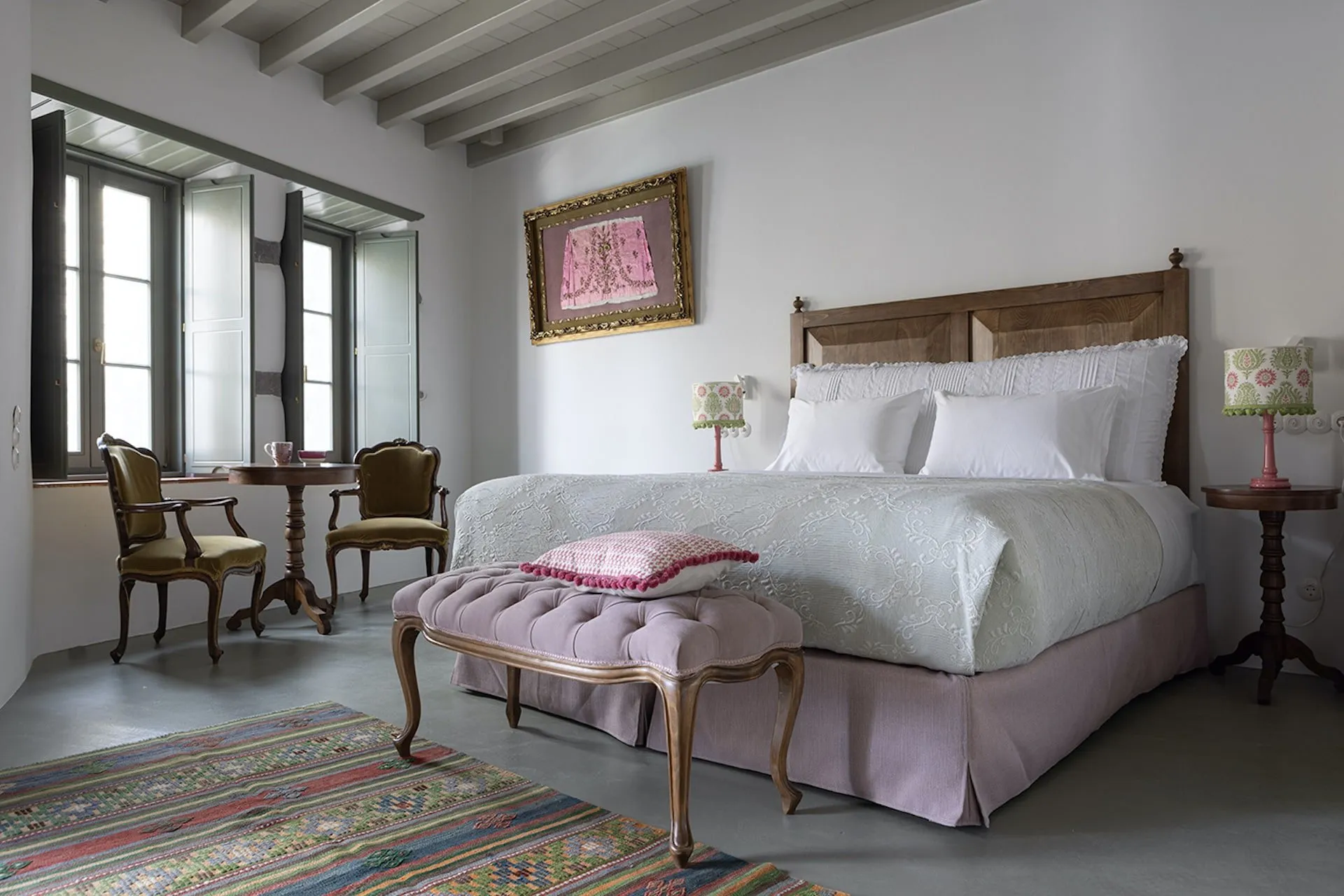This year, the tasteful rooms and suites of Patmos Eye were added, remaining faithful to the spirit of authenticity, refined elegance, and personalized hospitality that distinguishes the island itself and the couple’s vision for the kind of services they want to offer. Wooden beds, bedding with lace trimmings that seem to have come from grandmother’s wardrobe, mirrors and decorative items bearing the patina of time, modern, thoughtful amenities, private pools, spacious verandas, outdoor dining areas, and always the same view you never tire of at any time of day, characterize a hotel that faithfully renders the sophisticated character of Patmos – its history, spirituality, and understated cosmopolitanism.