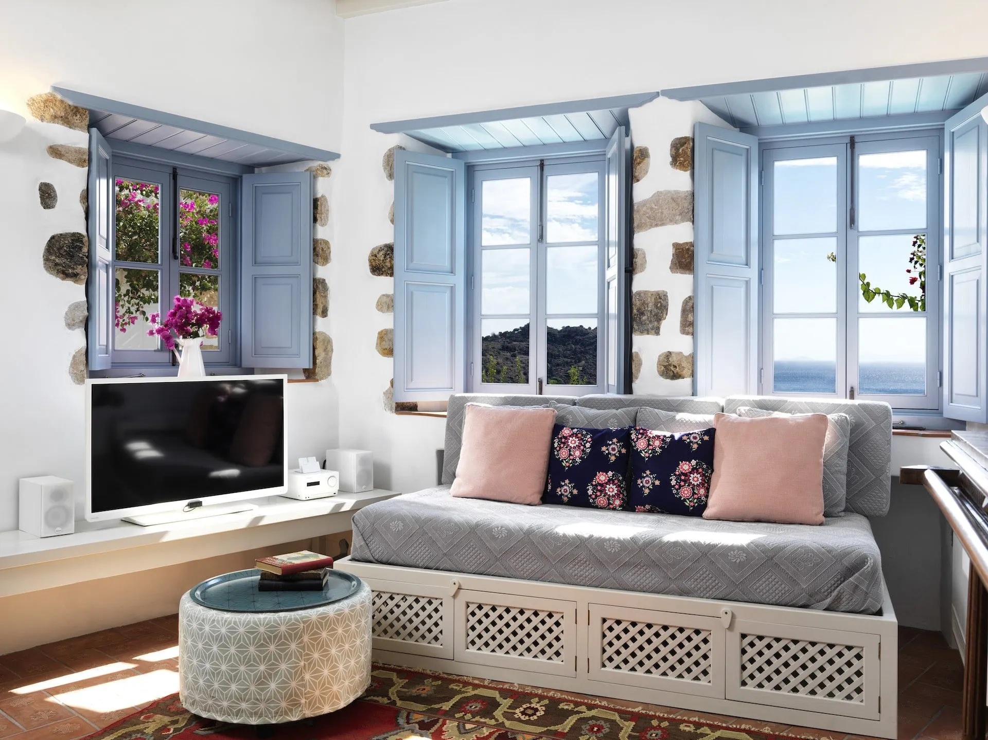 Overlooking Skala bay and just 400 meters from the port, the spacious villas were completed first, reviving the style of imposing Patmian mansions of bygone eras and incorporating typical island structural elements such as stone arches, terracotta floors, and exposed stones in white walls. The island breeze, like the enchanting view, invades from balconies and windows, reaches behind the gossamer curtains of beds, caresses the senses during moments of relaxation in outdoor sitting areas or private pools, which three of the four villas have. Ranging in size from 75 to 190 sq.m., on one or two levels, with fully equipped kitchens and welcoming dining areas with traditional furniture, they become an idyllic refuge for families and groups of friends up to 8 people, a real retreat that gives the feeling of a private, tranquil paradise while being so close to the center of action.