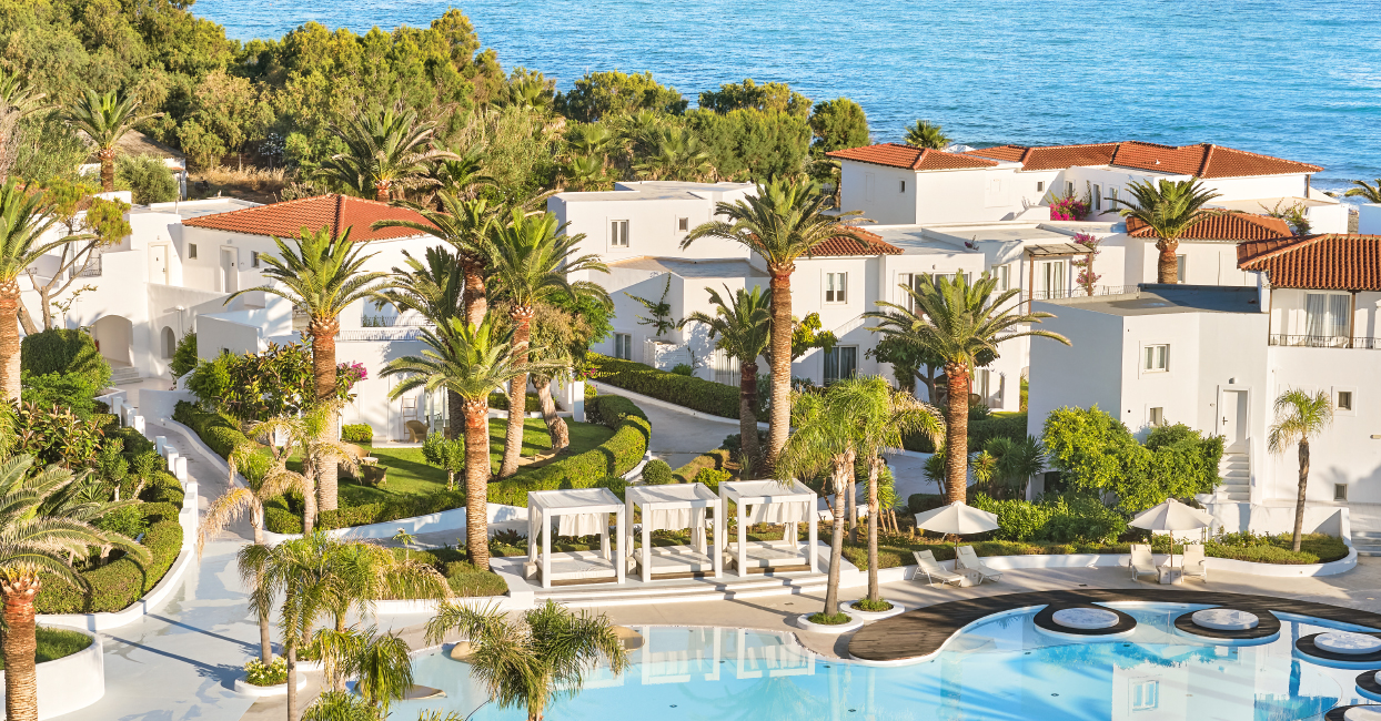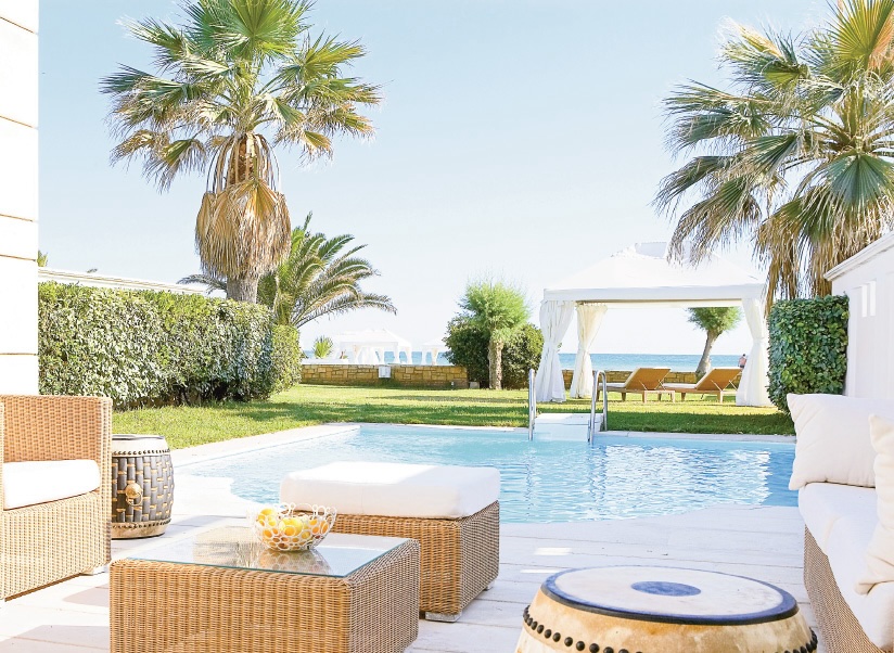 An even more exclusive paradise, Caramel is so small and private, playful and avant-garde at the same time, that it creates an instant sense of intimacy. Its name is inspired by the ‘sugary’ beach it sits on, also home to the Caretta Caretta sea turtles, rivaled by the 700 square meter seawater pool with hydro-massage and unique leaf-shaped loungers. This detail highlights the importance given to the hotel’s design, which “plays” with vibrant colors and generous volumes, harmoniously blending retro and Mediterranean references. Present in both the suites of the main building and the bungalow suites and maisonettes, the eclectic style is reflected in handmade tiles, designer fabrics, and contemporary furniture with authentic antiques, reaching its peak in the dreamy villas that can accommodate up to nine people.
