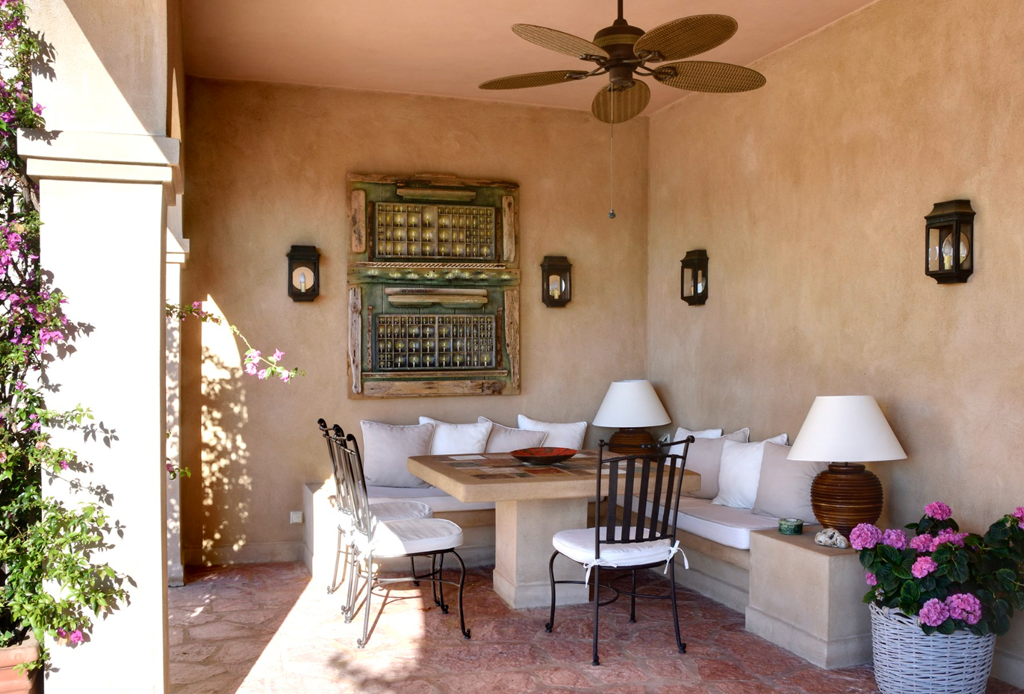 In the main building, natural materials and earthy tones dominate, from soft ochre to warm terracotta. Beyond the welcoming reception area, find a rustic-style kitchen with ultra-modern equipment, leading to its own shady veranda and open sitting area with classic furniture, dining area on one side and cozy living room with fireplace on the other. The large central entrance glass allows views to permeate the space, making it seem unified with the exterior and a natural continuation of the shady or sunny courtyards’ openness.