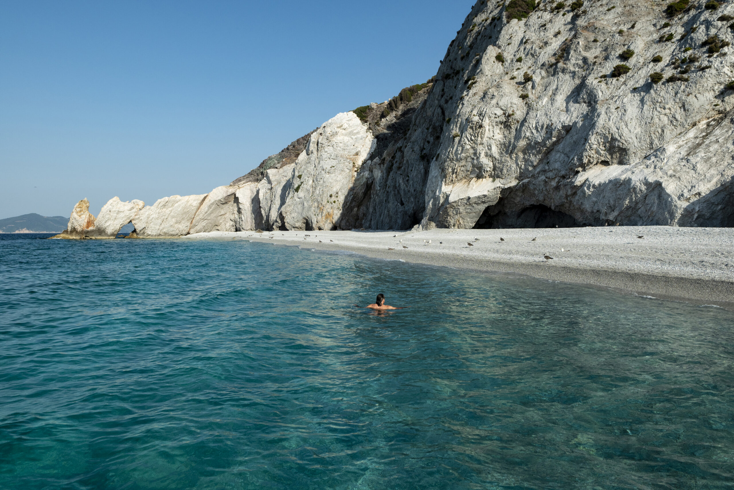 Banana Beach rivals Koukounaries in fame. Water sports enthusiasts and beach party lovers favor it. Big Banana exudes a cosmopolitan atmosphere, while Little Banana maintains a quieter vibe. Lalaria, with its pebbles, rightly ranks among the Sporades‘ most enchanting beaches. Towering white cliffs dominate the island’s northernmost point, with one forming an impressive sea gate called ‘Tripa Petra.’ Access only by boat makes the experience unique.