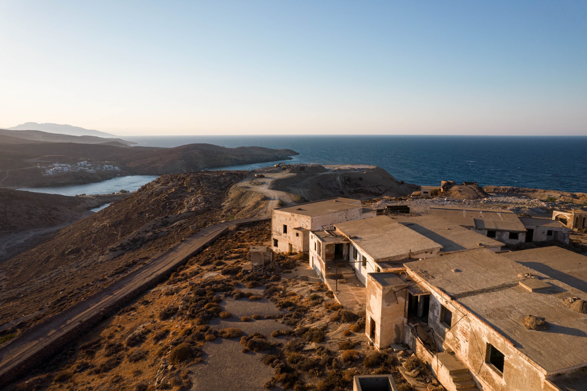 On the eastern tip of Mykonos, near the area of the coast called Tigani, are the old mines of Mykonos. At the beginning of the 20th century, the white mineral barite was mined here. Abandoned in the 1980’s, the buildings and machinery have crumbled and rusted leaving behind a dystopian landscape.