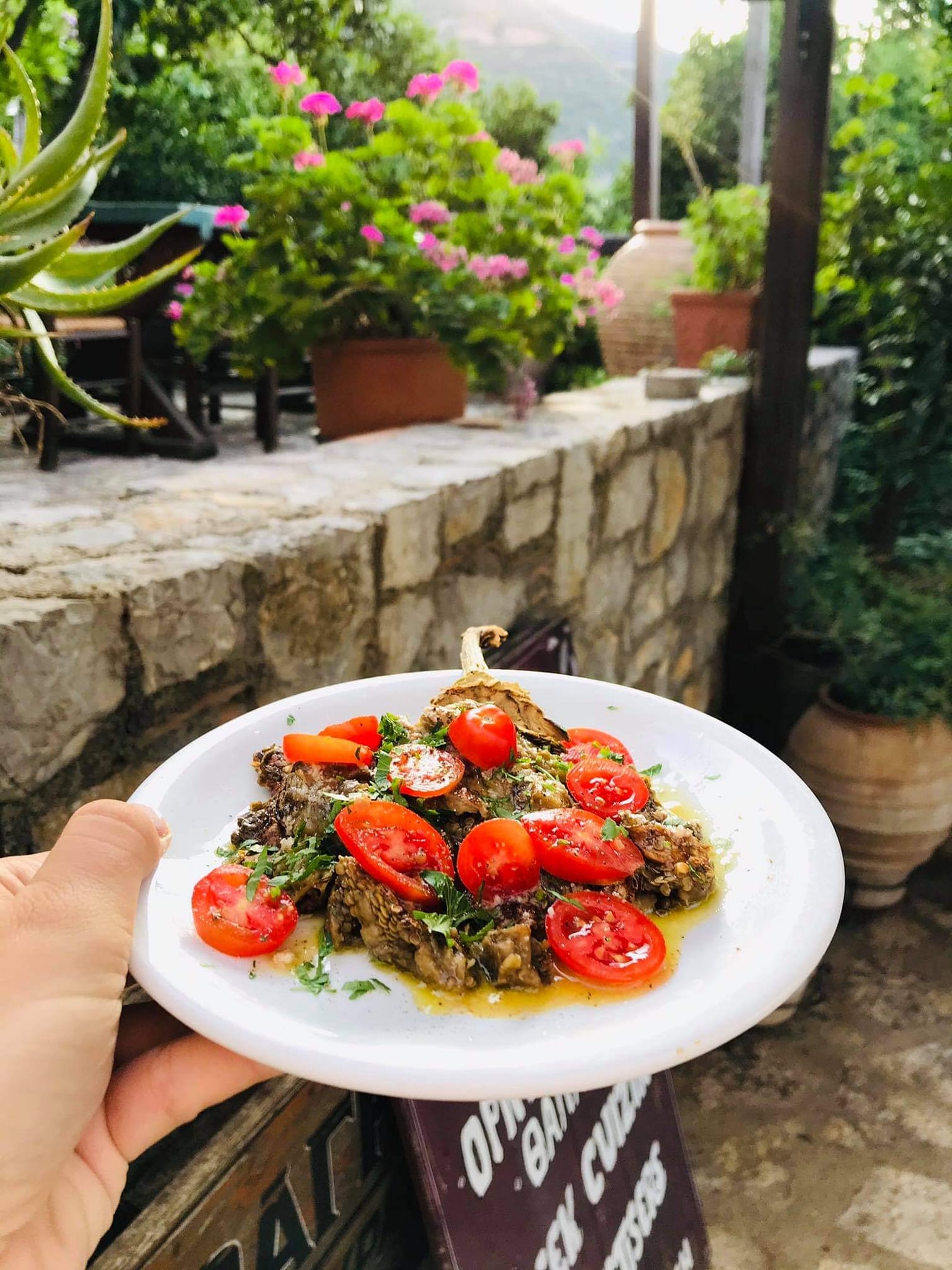 A bit further back from Gialasi you’ll find the stone building of Kalogerikon restaurant and will be seated in the garden, surrounded by orange trees. Apart from the interesting twists to traditional dishes like imam (traditional stuffed aubergine stew) with the caramelized onions, the baked octopus with wine sauce and the organic chicken with hilopites (a Greek pasta made with egg), they also serve local meat. The pork steak and the beef rib-eye steak are both really good choices. Another plus is the great selection of Greek wines and the local bread.