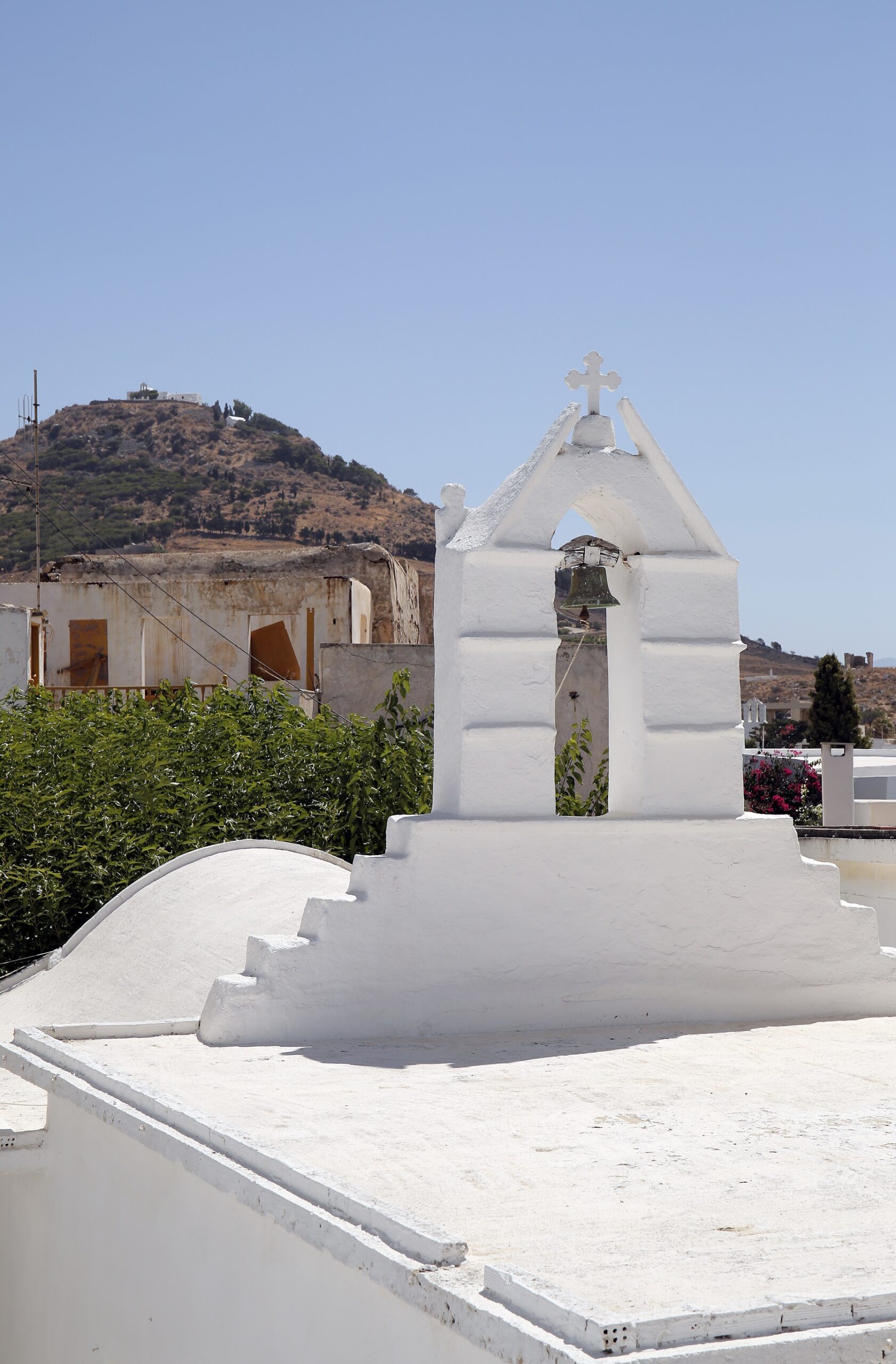 A fortified farming settlement with distinctive walls made up of the outer houses, the village is full of narrow, arched walkways and bougainvillea-filled pedestrianised streets that lead to the Church of Agios Ioannis with its distinctive bell tower.