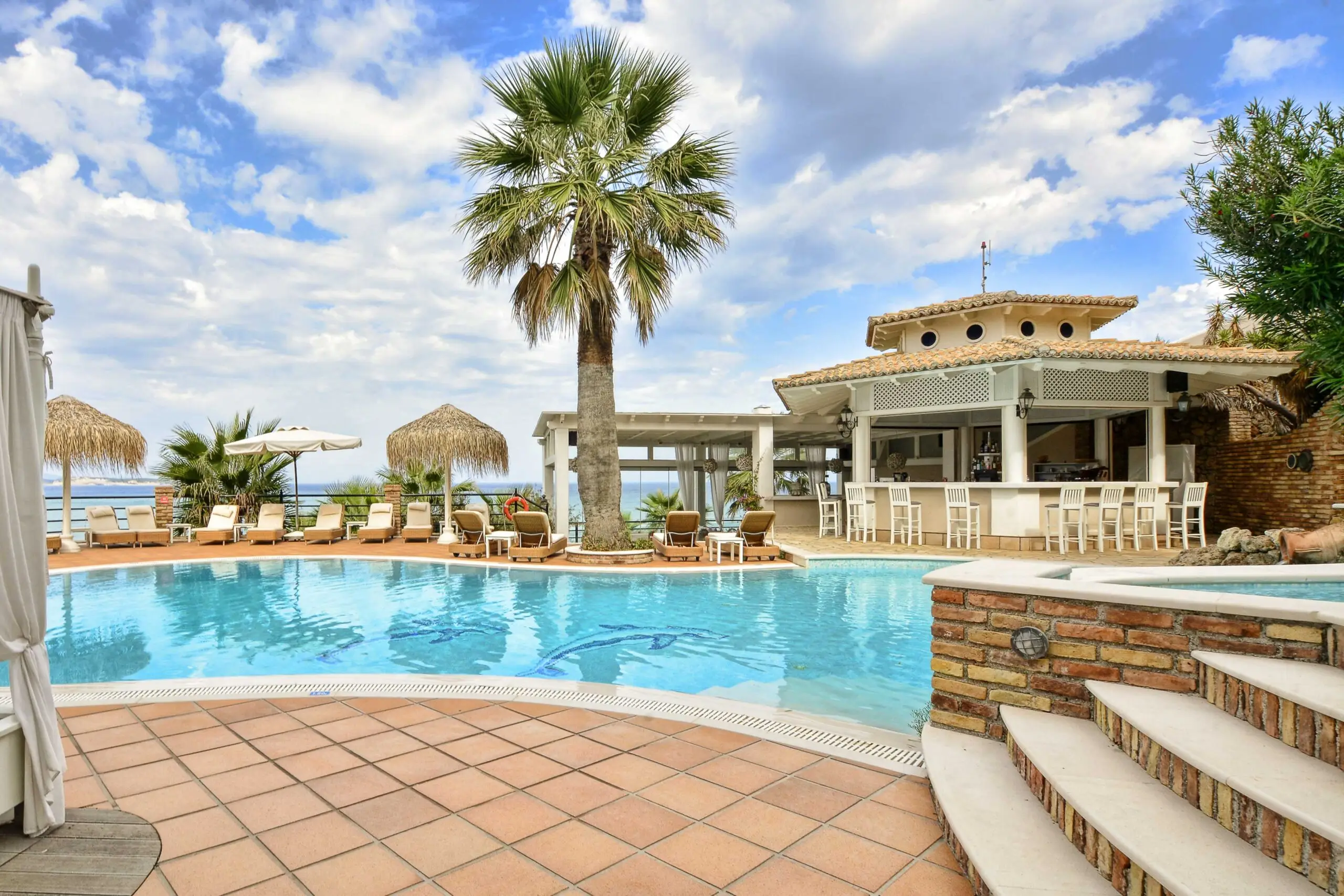 A luxurious and high-end Grecotel Group hotel located on the lush, private peninsula of Kommeno. It features upscale villas, bungalows, and suites with private pools that offer stunning views of the sea and Corfu Town. The resort has three private coves with sandy beaches, 16 restaurants on the sea, a central pool, and 24 private swimming pools. The two-story Elixir spa, tennis courts, state-of-the-art gym, and manicured, shady gardens with cypress and lemon trees provide guests with relaxation and rejuvenation. A golf course is nearby.
