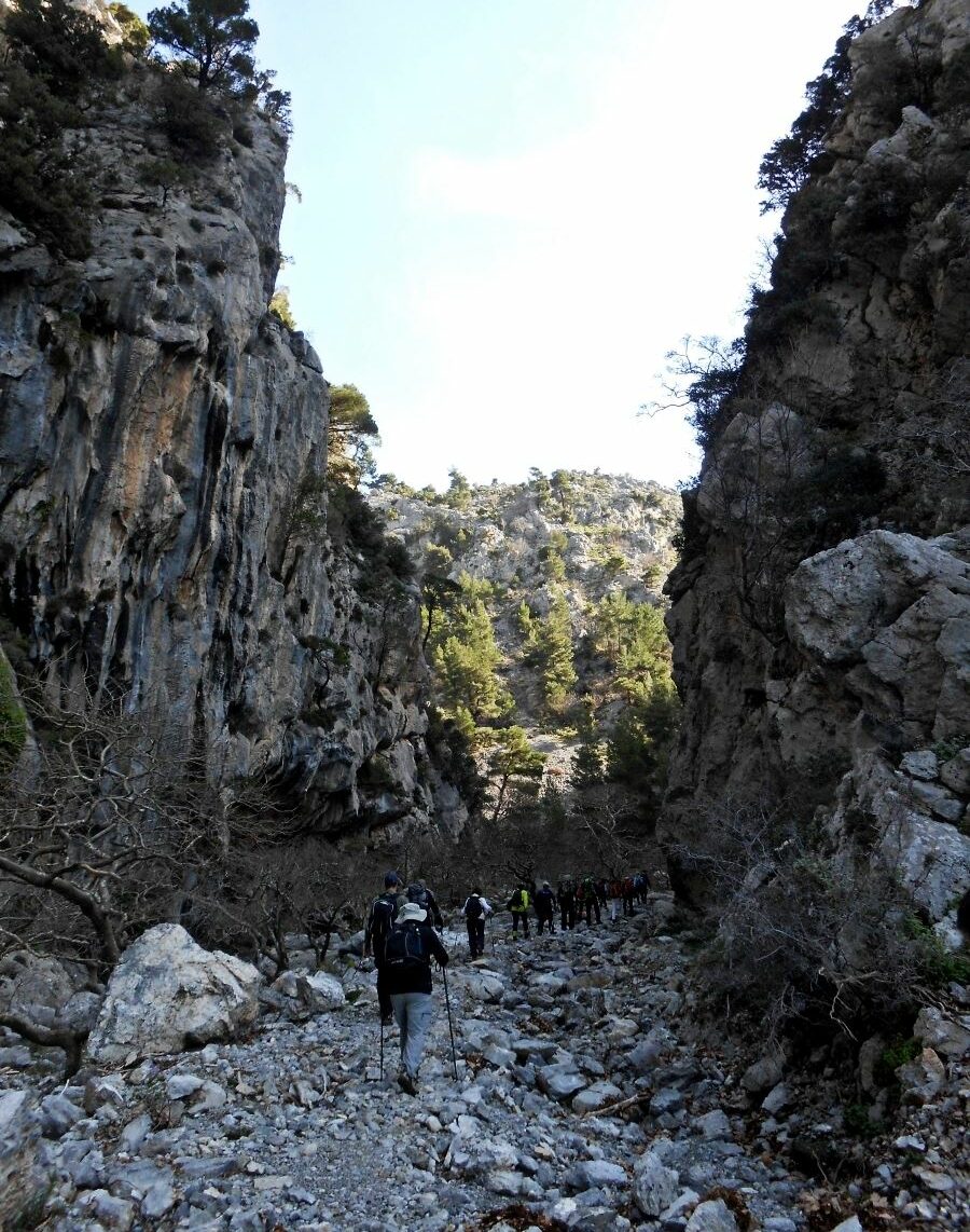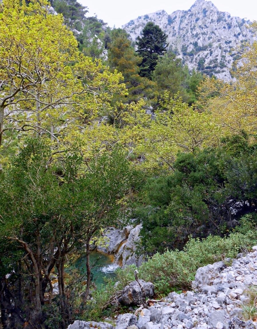 One of the most enchanting features of the gorge is the changing landscape. The section of the trail following the stream’s course is filled with aromatic plants like thyme, oregano and rosemary, as well as age-old plane trees, maple trees, and oaks. Occasionally, a chestnut tree emerges, while small colorful flowers stand out among the rocks. The gorge does not always have water throughout its course, however, there is a section where, winter or summer, water is present, forming mini waterfalls and small pools.