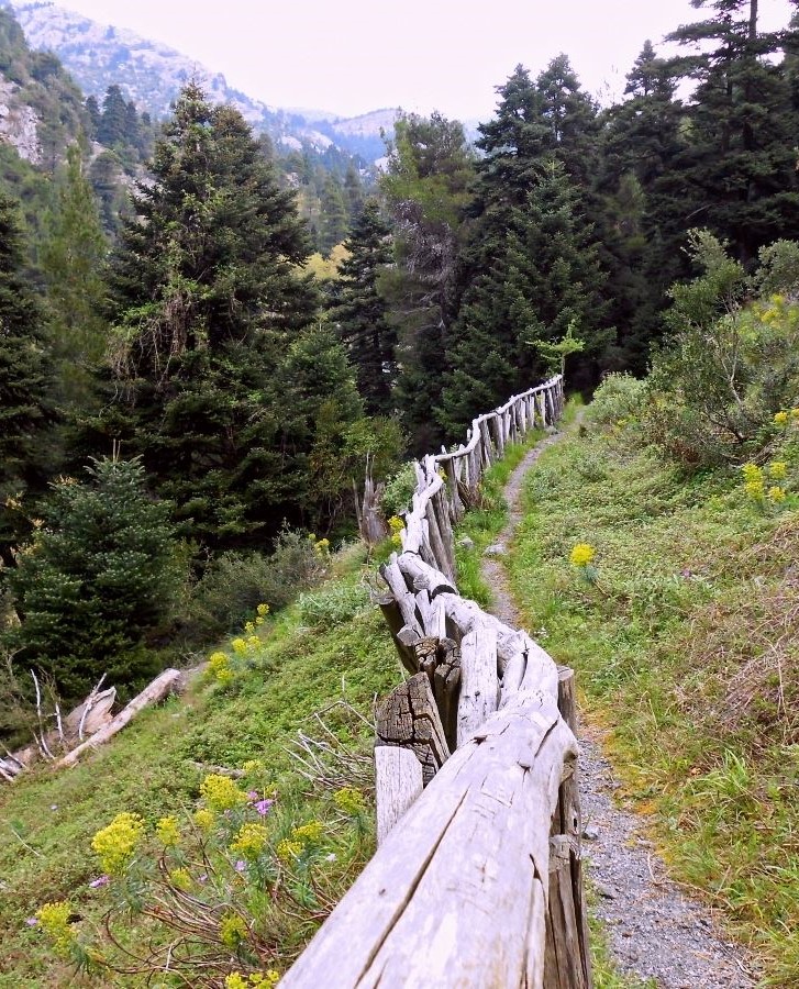 From here on, the path gradually becomes even more uphill, and the nature changes as the elevation does in turn. The pines and firs now gain ground and make the path much greener. Especially in spring, among the fresh grass, you will see small chamomiles, bright red anemones, buttercups, wild violets, bellflowers, and numerous other wildflowers making the landscape much more beautiful. It’s an explosion of life and color.