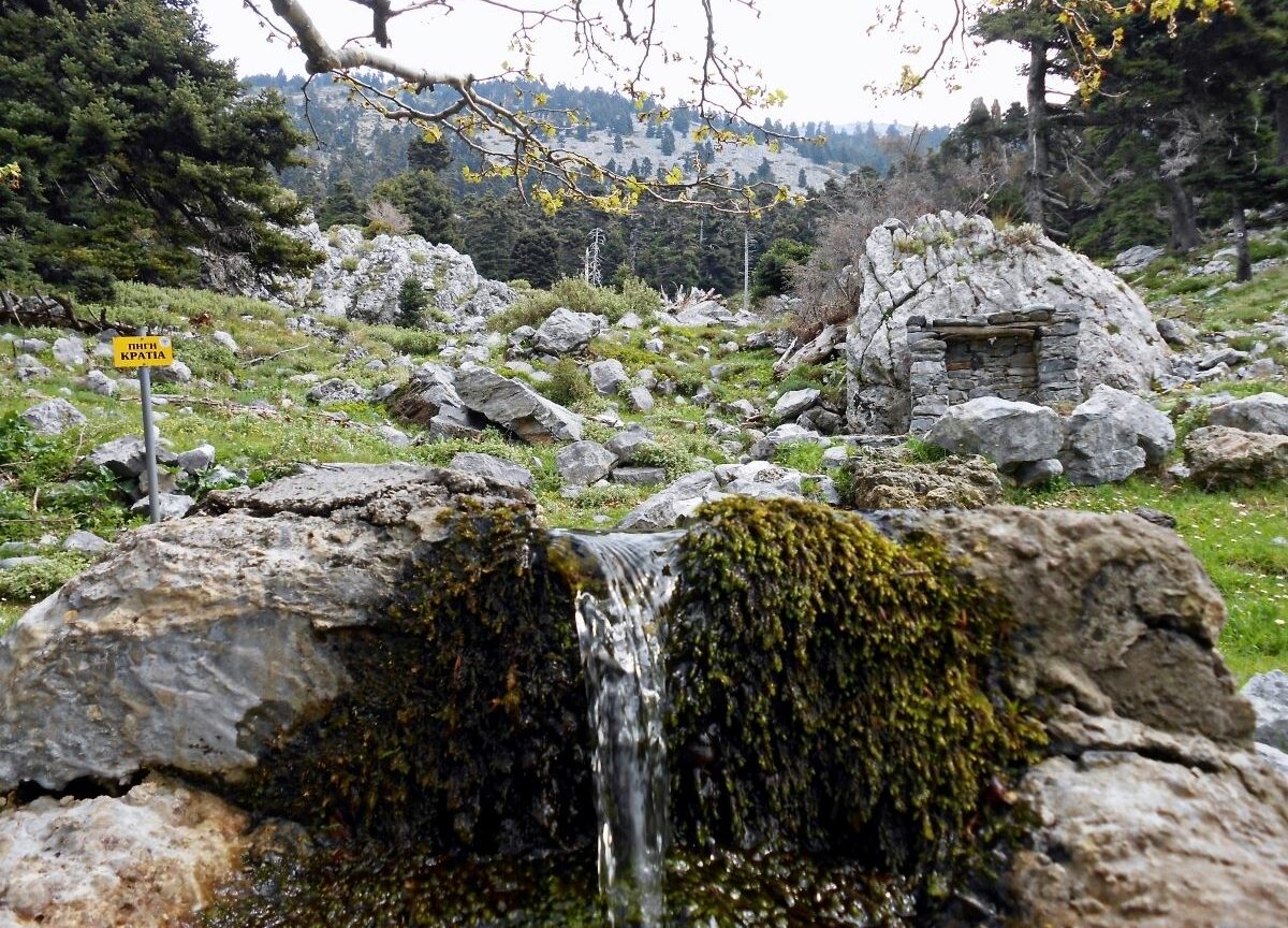 Following the red marks made on trees and rocks, you will reach an elevation of 730 meters at the location “Kratia,” where the eponymous spring is found. This spot usually marks the end of the trail and is ideally suited for resting before you start your journey back. However, if you wish, you can continue with the following two options: either take the path that goes east towards the Chalkida EOS refuge or the one that mainly heads northwest and reaches the small wooden refuge – lookout of Agali, on the provincial road leading to the small village of Glyfada. The first path can be combined with accommodation at the refuge by arrangement, or a car can wait to take you down to the village of Steni to rest and indulge in local delicacies at the charming taverns. The second path will lead you to Glyfada through a trail or, in this case, a car can also wait at the lookout to take you on the return journey.