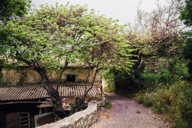 Within minutes, we are at the entrance of the settlement. Silence prevails. We leave the car at the entrance and start walking. The settlement is engulfed in greenery. Opposite us, the characteristic stone houses stand out. These are two-story structures with tiled roofs. Some are dilapidated, while others have been carefully renovated, adhering to preservation regulations. A little further down, the road is carpeted with the purple flowers of the Judas tree.