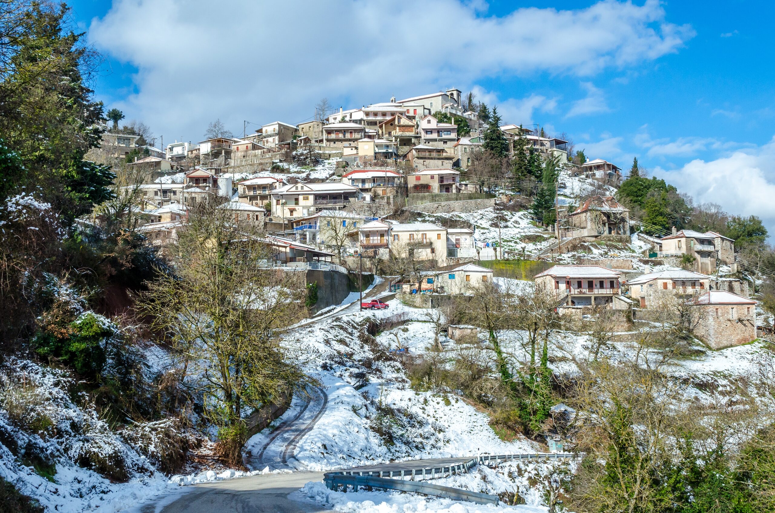 In the village, you’ll find coffee houses and tavernas, and the main event of the year is the feast of Saint Vlasios on the 11th of February. During the winter months, it’s not uncommon for the village to be blanketed in snow.