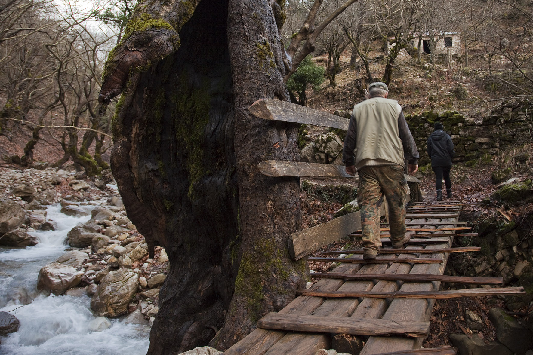 While we were there in wintertime the village was essentially deserted, but this allowed us to admire the arched bridges, water mills, stone houses and alleyways of Marathos. They were in better condition than one would expect in such a small place, as even those who no longer live here love and look after it. At the watermill, we meet one of the few permanent residents who explains how difficult daily life is in such a place, especially in winter. For him, moving is not an option; his life is completely identified with the mountains and waters of the area.