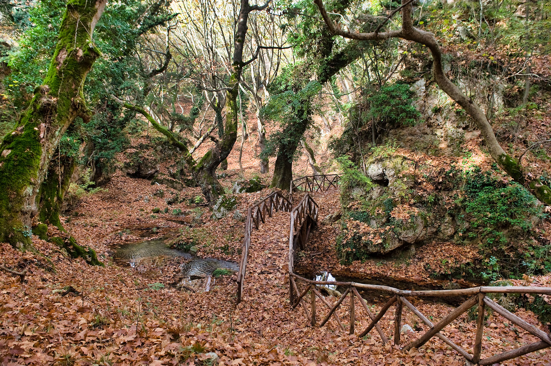The perennial plane trees offer wonderful shade even on the hottest days, while the abundance of ivy and vines – sprawled on the trunks of the trees – create the aforementioned “jungle” impression, combined of course with the special flora of the area. The picturesque wooden bridges also ensure that even some of the most difficult parts of the route remain easy to cross and perfectly safe.