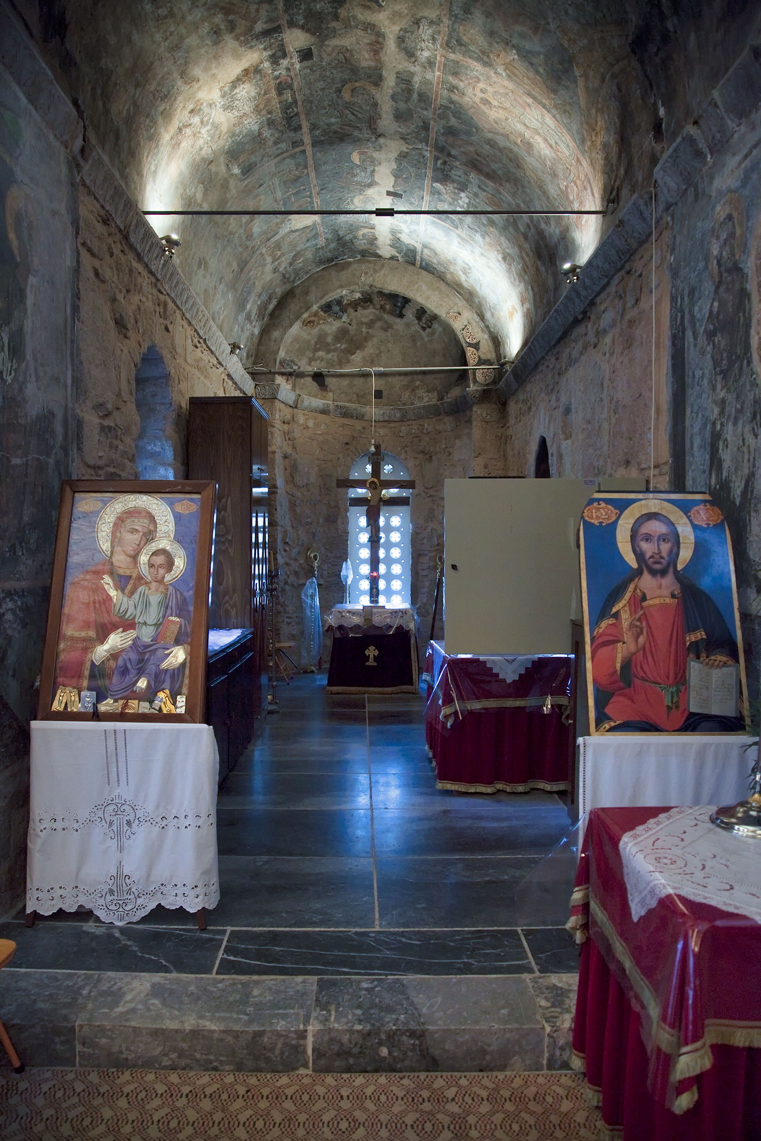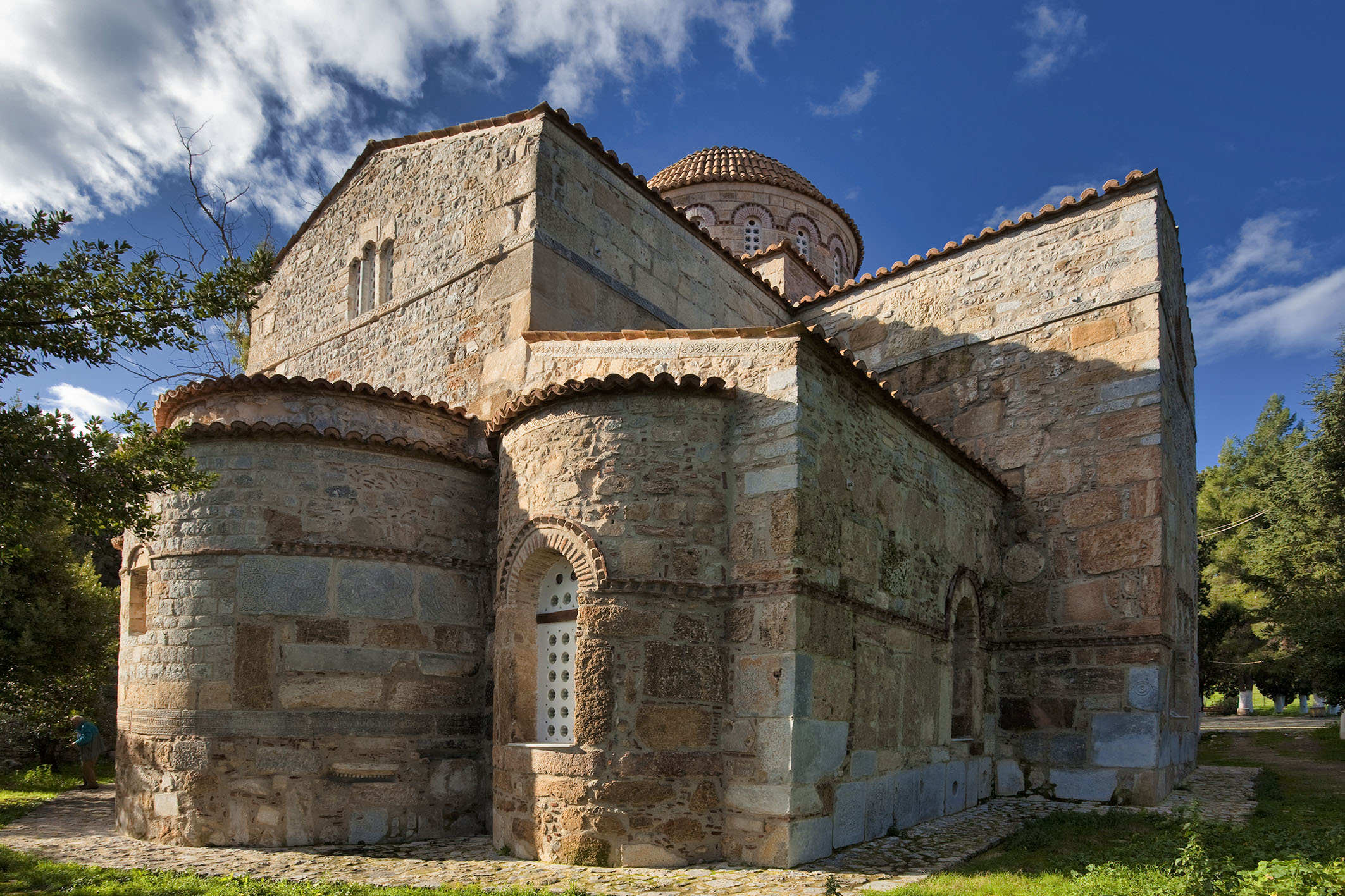 The monastery is built in the well-known ‘cruciform transitional’ style and is the most important church of this architectural kind in Greece. Its style is a mixture of the free cross and the three-naved basilica with a dome. It represents the intermediate phase before the establishment of the cross-in-square plan, which is the most familiar architectural style of Greek Byzantine churches, such as the churches of Mystras or the Monastery of Hosios Loukas.