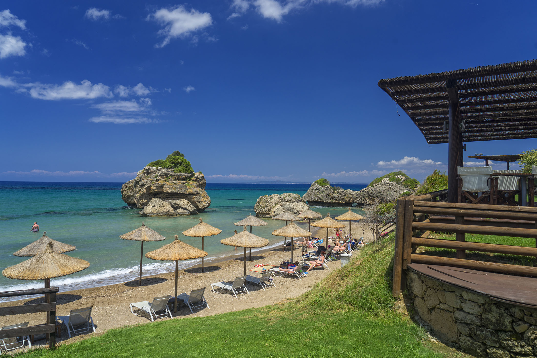 All these natural beauties, however, are ultimately eclipsed by the sea you’ll encounter here: its azure hues are genuinely something else – you’ll feel as if you’ve landed somewhere exotic, far beyond the customary exaggerations of our era’s travel reports. It is the primary reason, after all, why those who adore Pelagaki deem it something akin to a small, Mediterranean paradise. Furthermore, the waters are crystal clear, deepening relatively sharply, with a “crystalline”, refreshing sensation, familiar to other beaches facing the Ionian Sea.