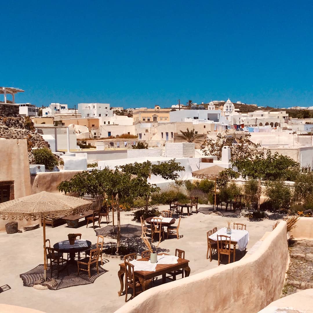 On our spring journey to Santorini, our first stop was the Paradosiako (traditional) Café of Megalochori. With its pebbled courtyard, mismatched tables, colorful cushions, outgoing hostess Magda at the entrance accompanied by her loyal dog Sa and white cat Beethoven, this spot immediately signals you’re in a welcoming, timeless village. Although this café, now central to Megalochori’s social life, opened only a few years ago, it already feels brimming with stories from the past. Maybe it’s the heirloom furniture from Veria, brought here by smiling Magda, or perhaps it’s the furnishings donated by villagers when her initial plan for a women’s accessories shop turned into a café.