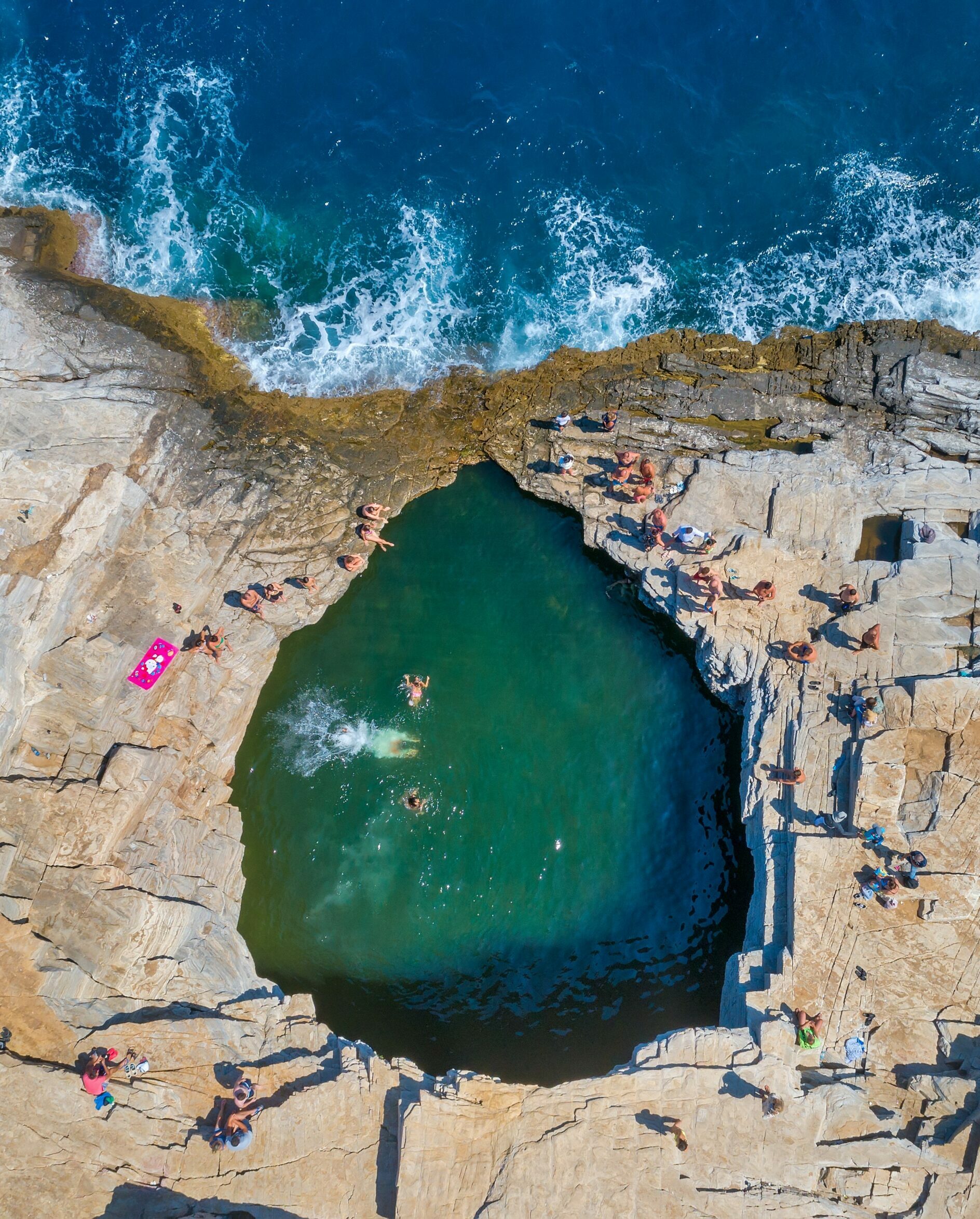 Another iconic swimming spot is Giola – a natural rock pool carved into the rugged southern coast of the island. Shaped by millennia of crashing waves, this crystalline basin, nicknamed “Aphrodite’s Tear,” is about 20 meters long, with water that glows a surreal emerald. Reaching Giola requires a bit of a hike, but the reward is one of the most photogenic places in the Aegean. It’s best visited early in the day or outside peak season, as the flat surrounding rocks fill up fast.