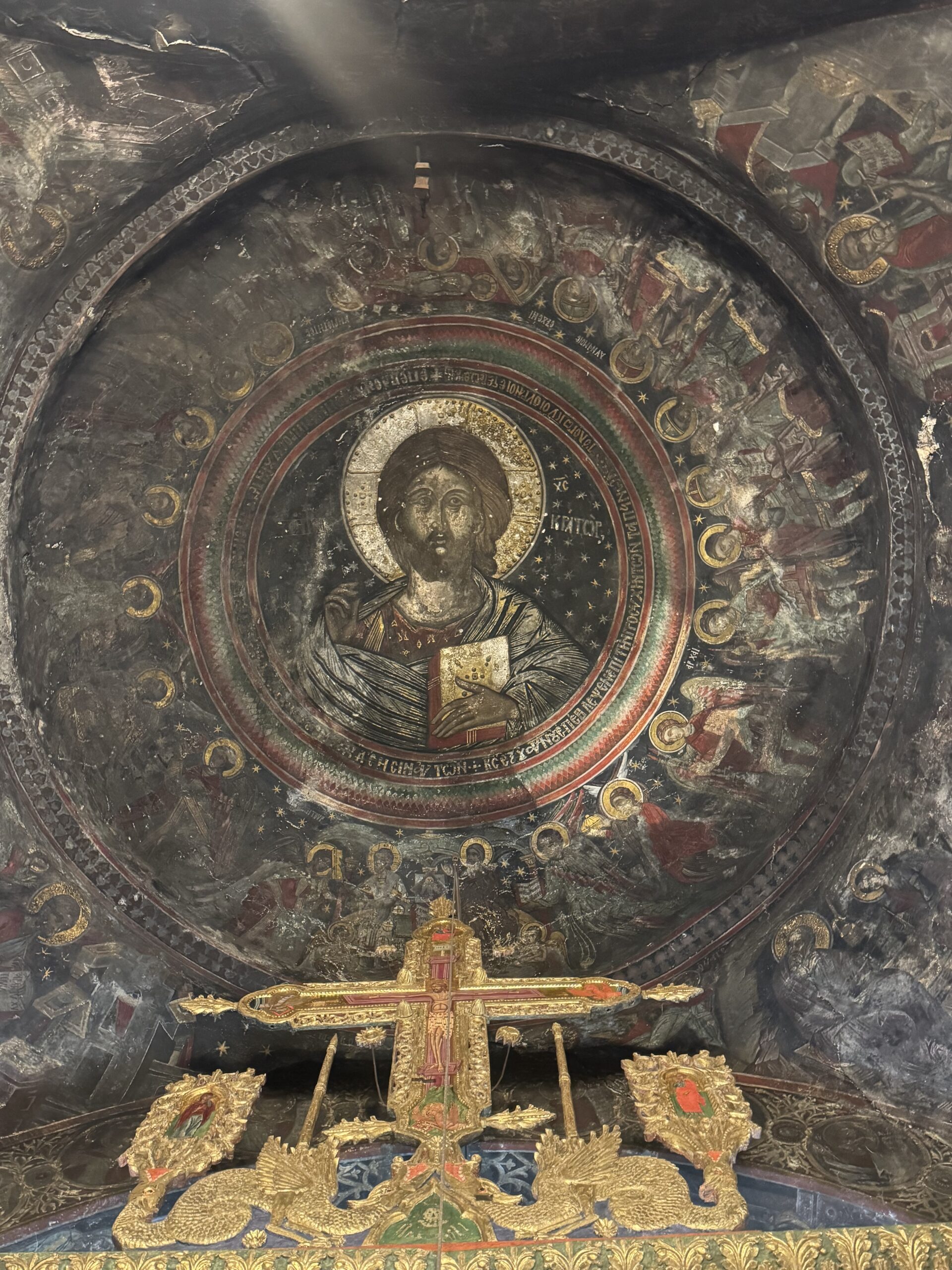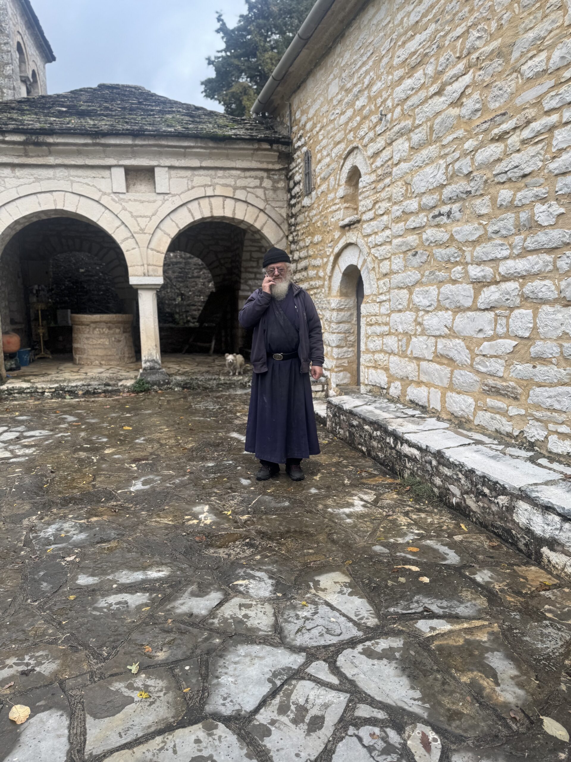 One of Zitsa’s most important landmarks is the Monastery of Prophet Elias (Profitis Ilias), founded in 1598 and set on a hill overlooking the village and surrounding countryside. The site is closely linked to Lord Byron, who stayed here for two nights in 1809 after being caught in a violent storm during his travels through Epirus (though local legend has it that he was enjoying the local wine and a love affair), an episode later referenced in Childe Harold’s Pilgrimage. Today, the monastery remains a point of historical and cultural reference, valued as much for its panoramic setting as for its place in the region’s connection to European intellectual history. When we visited, we met the resident monk, who lives there alone with his dog, Tequila. He showed us the beautiful interiors that include antique frescoes as well as bullet holes from an Ottoman attack.