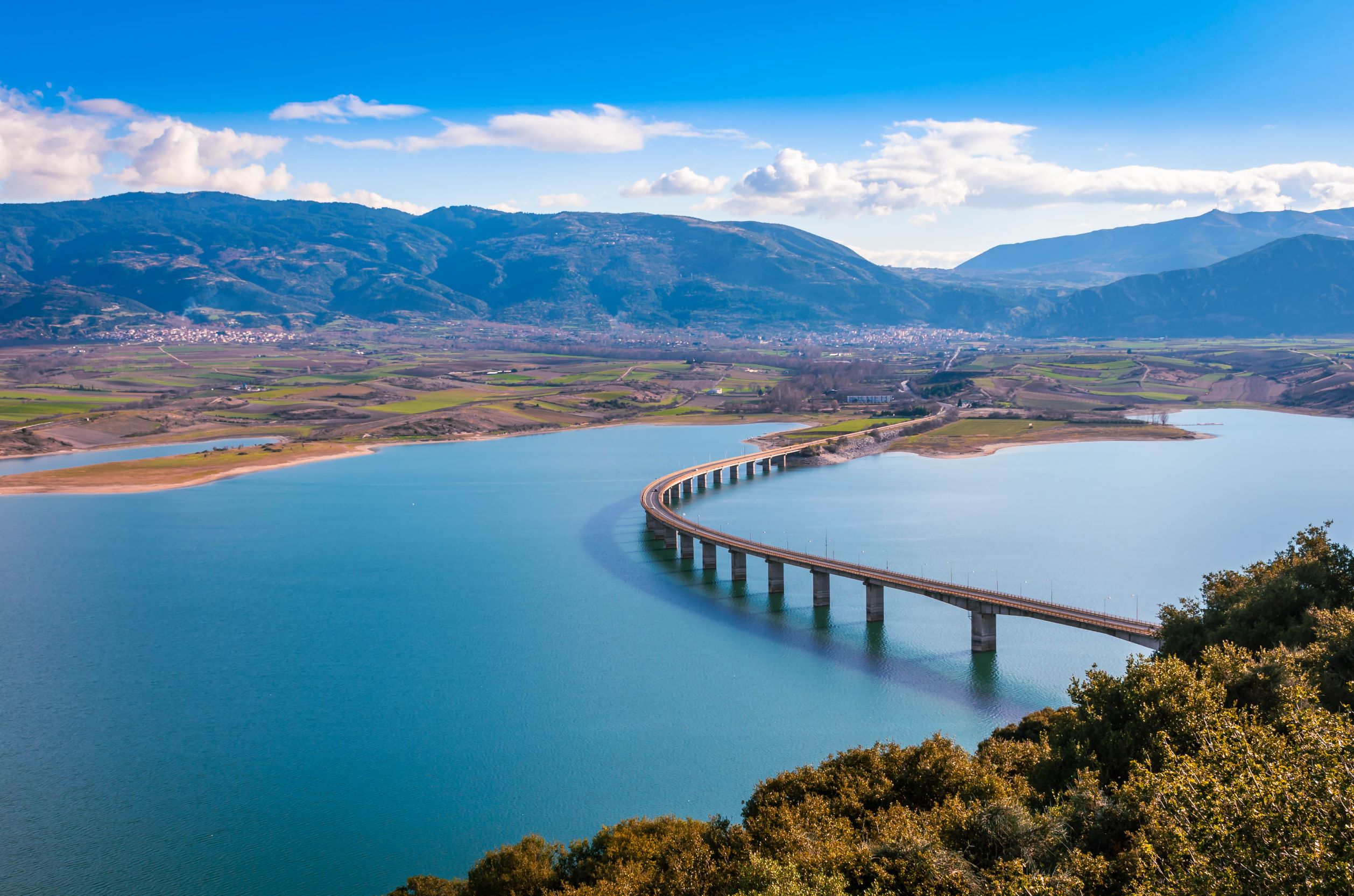 In the past, in the same location, there were other bridges, going over the river Haliakmon – already from 1890. The creation of the artificial lake created the need for a much larger bridge, as those over the river were less than 250-metres-long. Its 27 columns were placed before the lake was created, and its total length is 1.372 m. Crossing the bridge, either on foot or by car, is a remarkable experience.