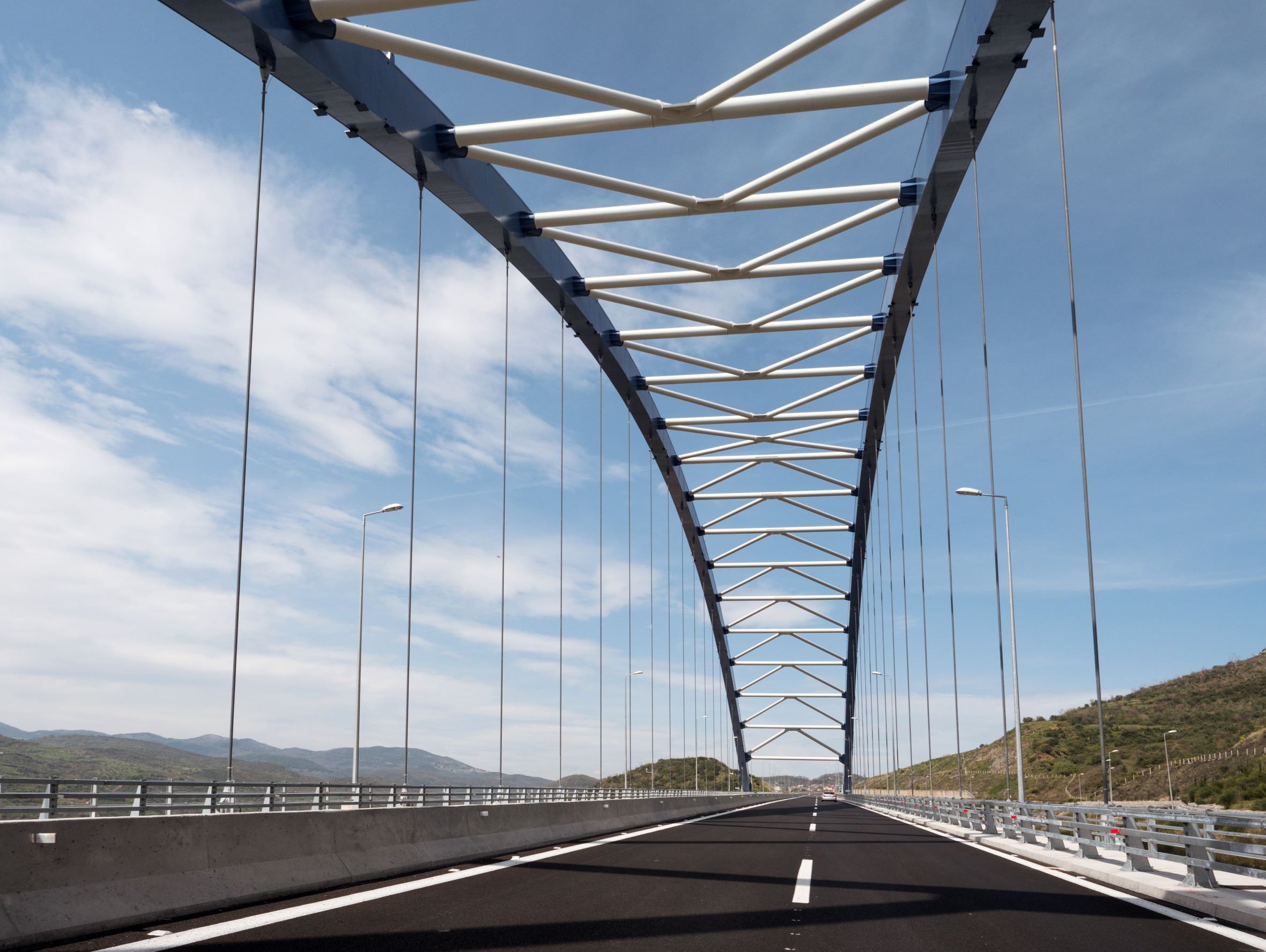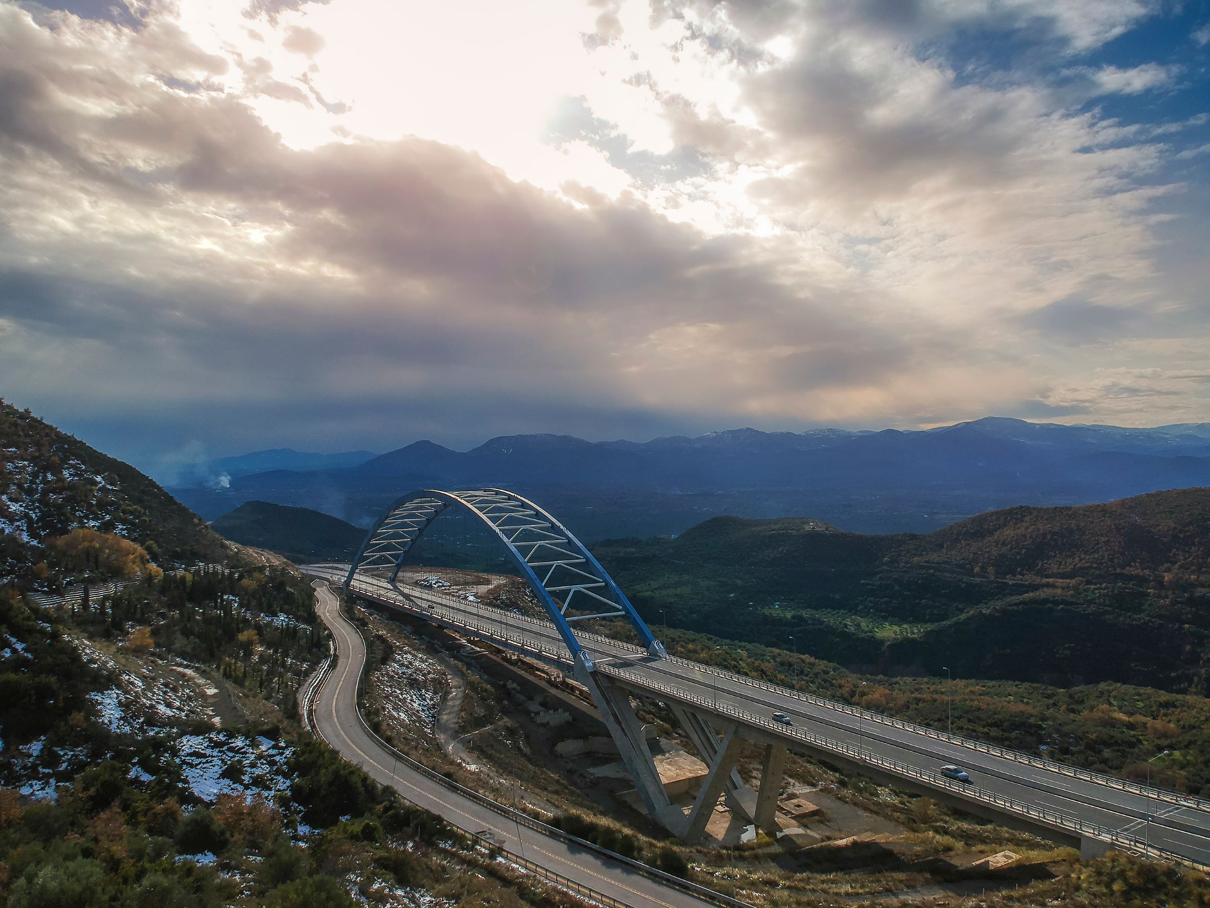 A bridge with an impressive building schedule and also an impressive visual and practical result. It was completed in 2016, after 8 years of construction work, and it’s one of the longest multi-span arch bridges in the world, the longest of its kind in Greece. Part of the Korinthos-Tripoli-Kalamata highway, the bridge crosses the Tsakona valley, an area where many landslides happen. This was one of the many technical issues the engineers had to address. The final result, apart from being very beautiful, is something they can be proud of. The bridge is 390 m. long, its second, 300-metre-long, span hangs from two steel arches that link the landslide areas.