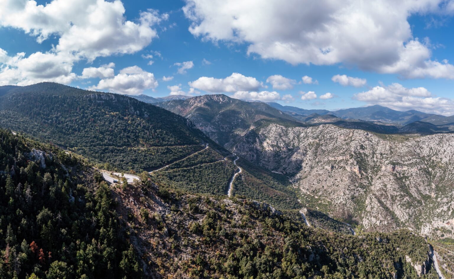 This route bursts with a cornucopia of Greek nature and tradition. Within less than 100 kilometers, you’ll traverse mountains, greenery, and a quaint village, and end up enjoying a coffee or meal with views of the Myrtoan Sea. From Sparta, situated at around 200 meters elevation, you’ll ascend the slopes of Mt Parnon, navigating through dense forests and winding roads that reveal spectacular views of ravines and hillsides.