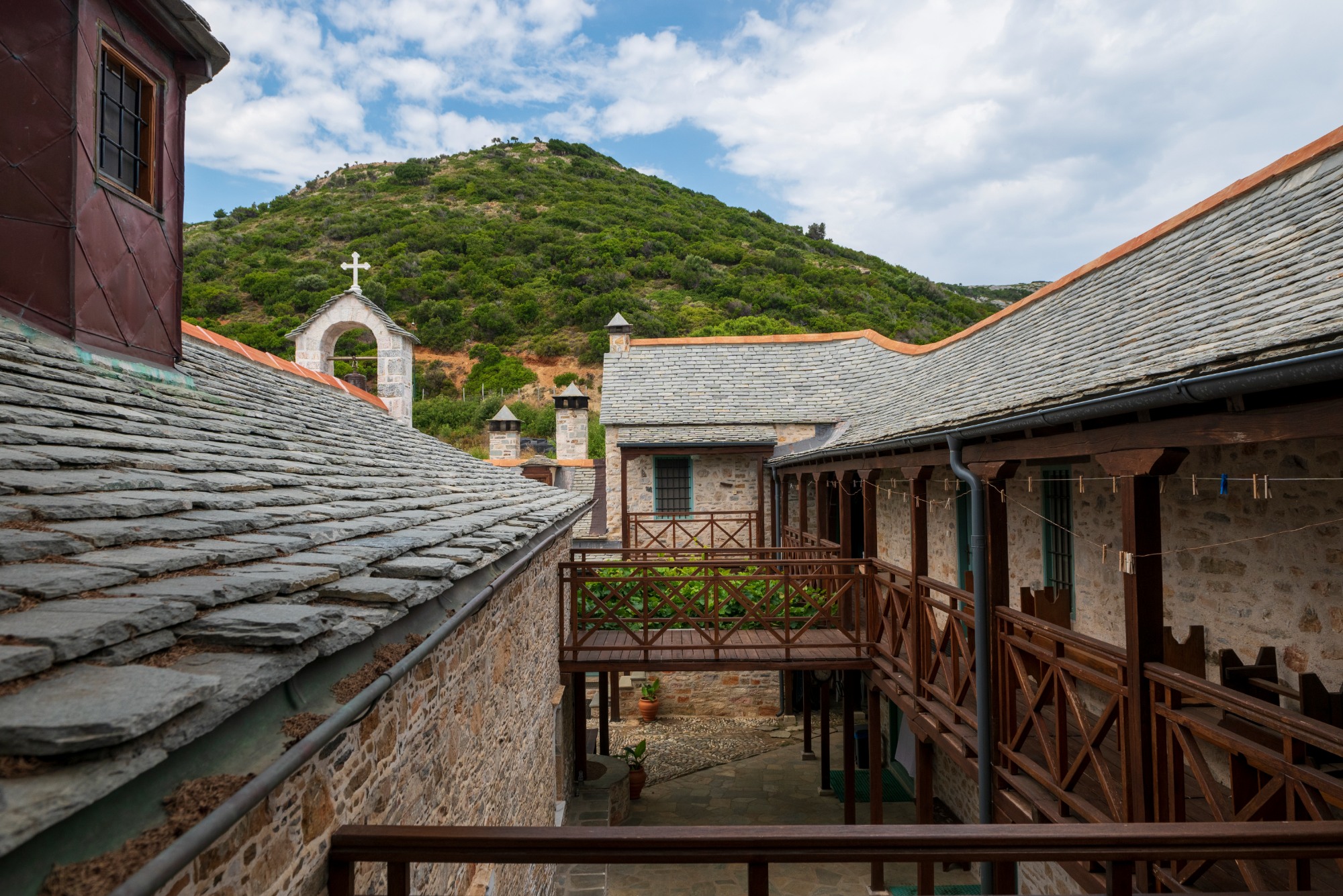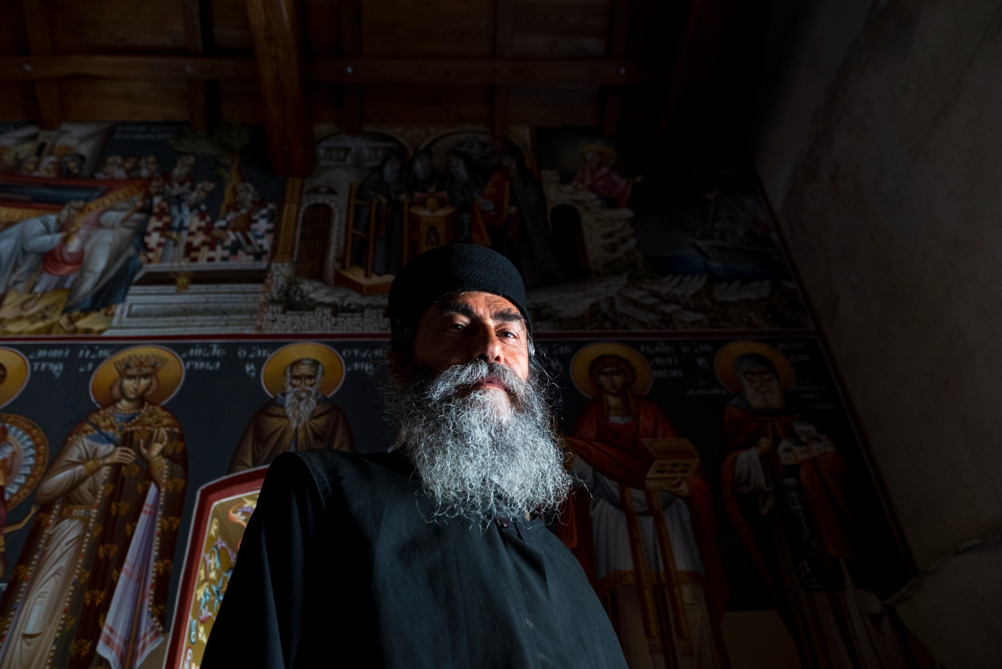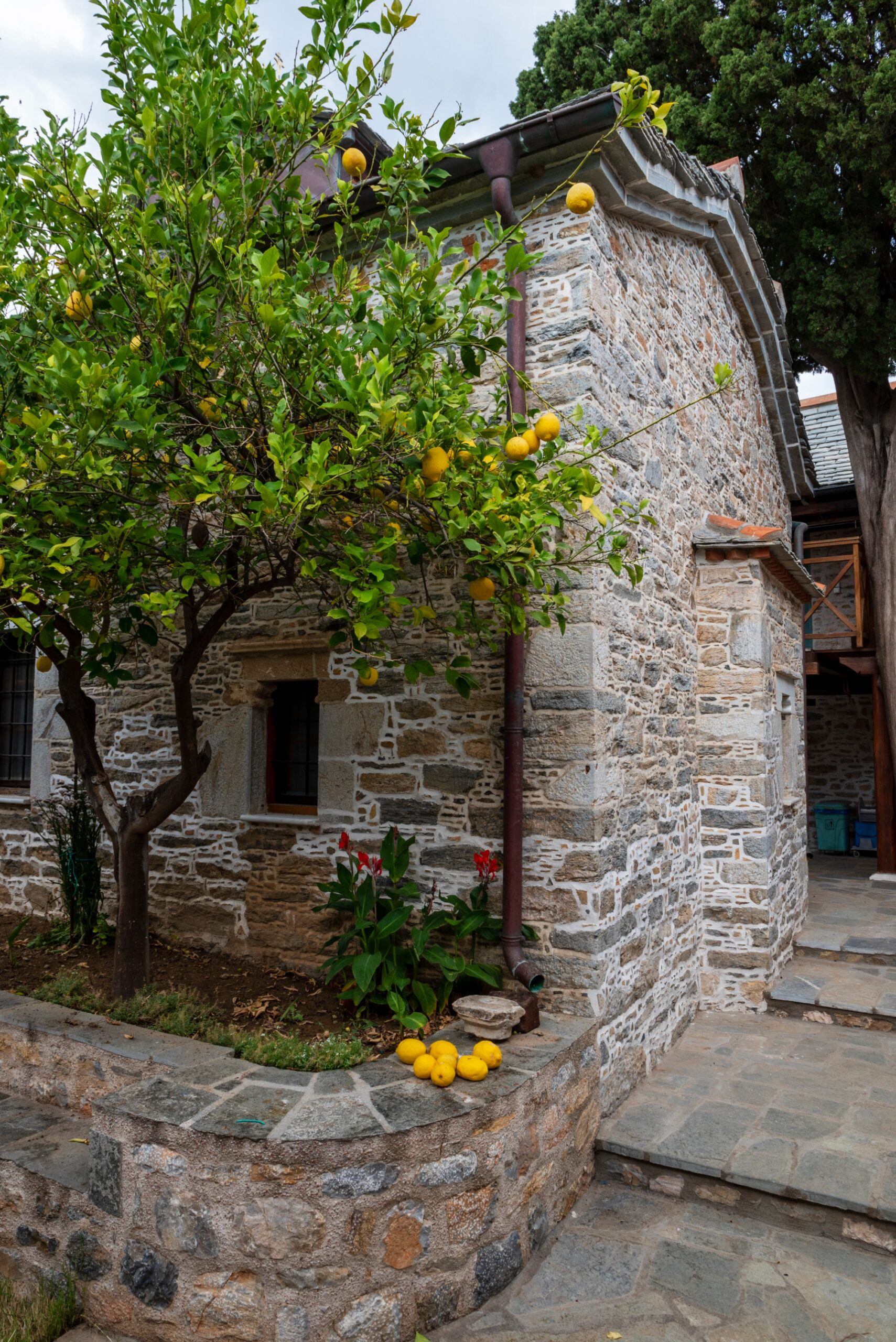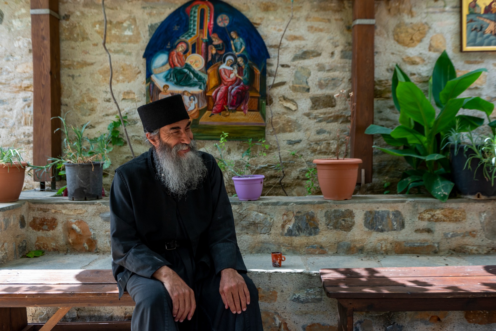 Father Haritos, who has been in the monastery since 2012, welcomed us with a treat and some tsipouro (traditional, Greek strong distilled spirit). We sat on the benches of the courtyard, unravelling a tangle of stories lost in the centuries. “The island was bought by Saint Athanasios of Athos, who is the founder of the Monastery of Megisti Lavra on Mount Athos. In 963 AD he built Megisti Lavra, with the assistance of the emperors of Byzantium, Ioannis Tsimiskis and Nikiforos Fokas. Thirty years later, in 993 AD, he bought the island of Kyra Panagia, for 70 golden Byzantine coins, from two monks, Savvas and Kosmas, who were forced to leave the island due to piracy. They had built a monastery in another location on the island, near Agios Petros. Its ruins can still be seen over the bay. This monastery was built on this site in the 17th century”.