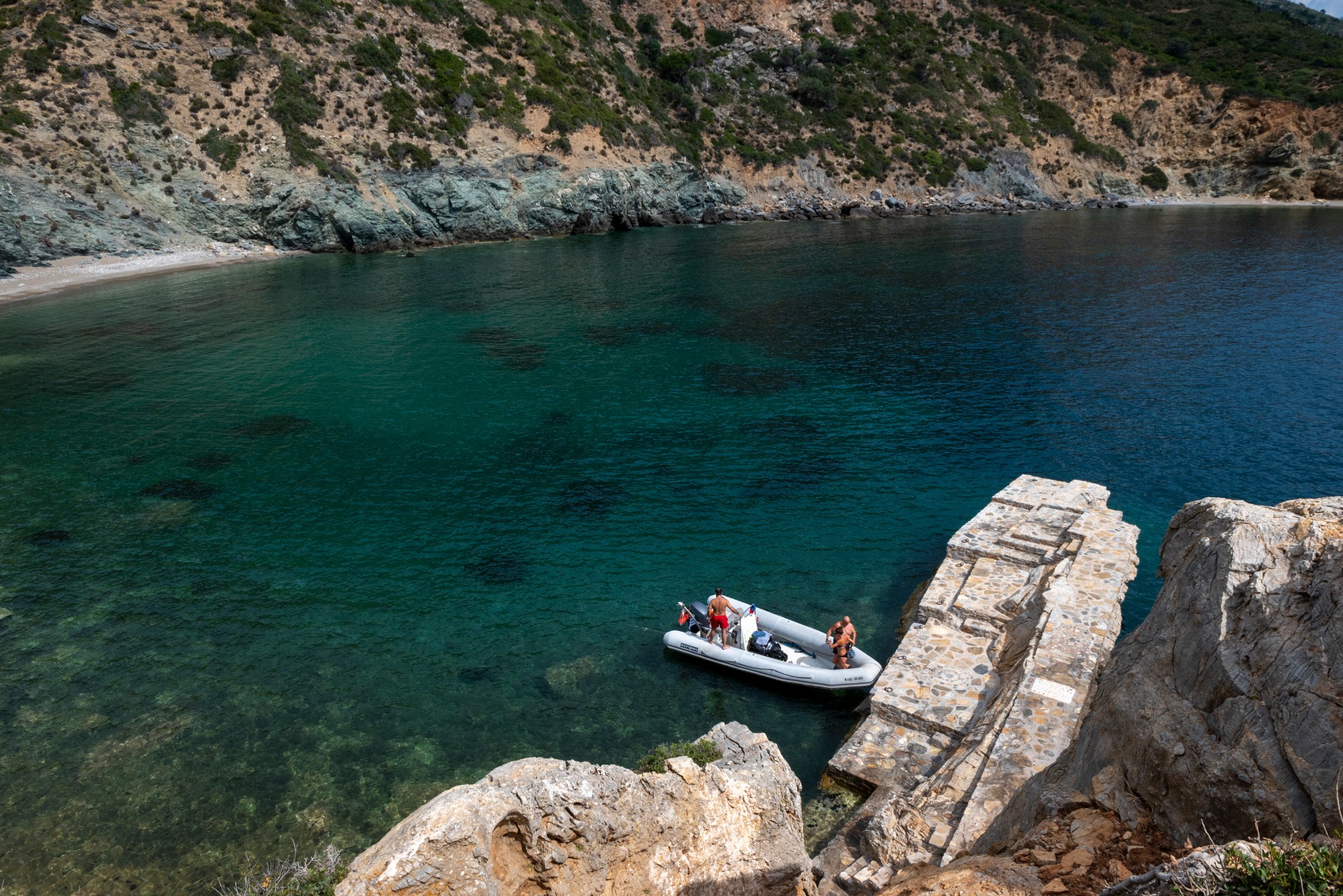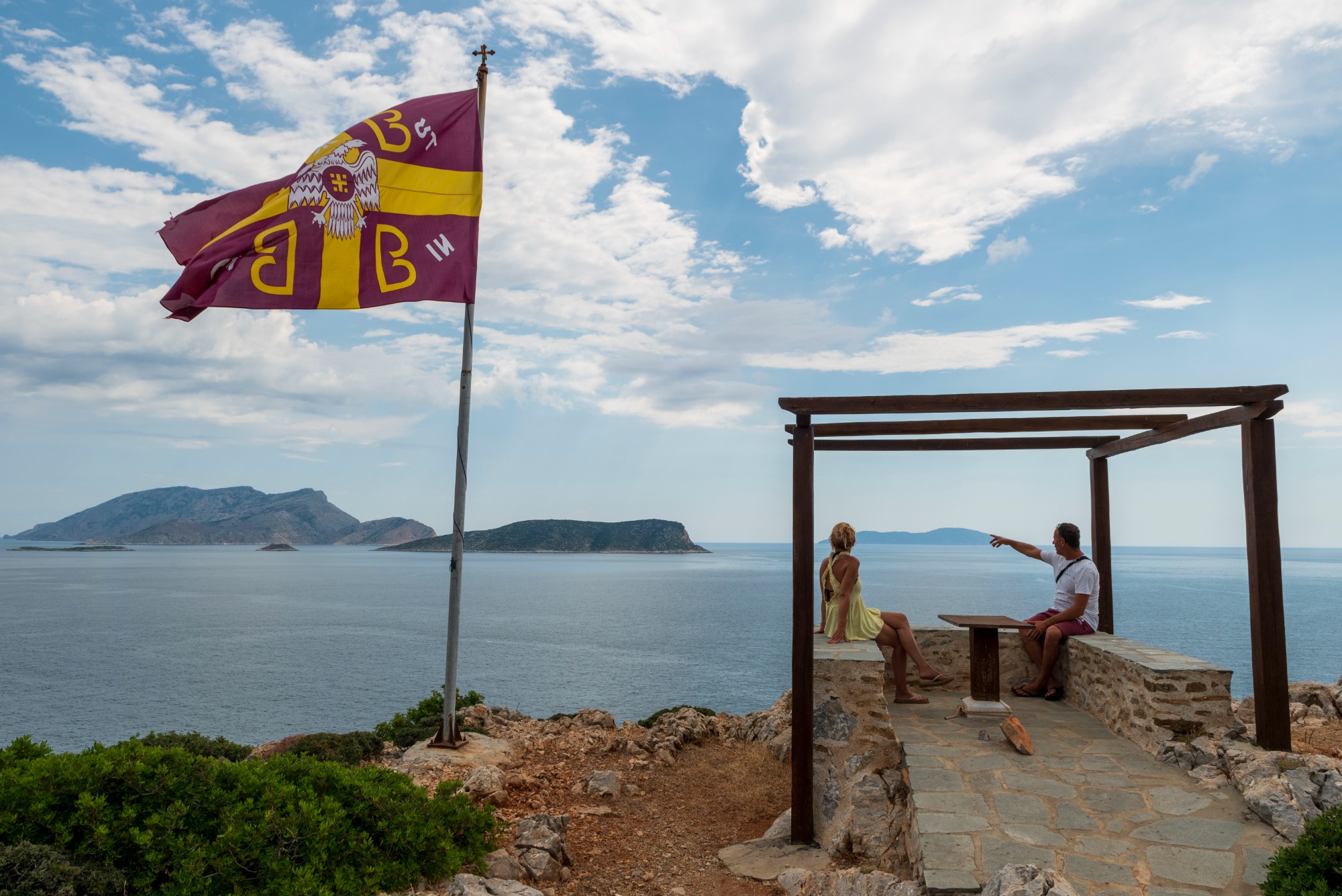 Kyra Panagia, a name that has prevailed over time, is located 3.5 miles northeast of Alonissos and the truth is that once the boat docks at the small pier, the first thing you want to do is dive into the crystal clear blue waters. Some people do it and no one can blame them. We, however, preferred to go uphill to the monastery and save swimming for the end. It is definitely better to go uphill, which in some places reaches a gradient of 15%, without the itchy rash that can occur after swimming. After walking for about 20 minutes, we saw the monastery. It seemed different from our last visit 14 years ago. It has been recently renovated, as we learned later. The view, however, was still the same. Amidst the endless blue sky and sea, the view of Psathoura, Gioura and some smaller islands of the marine park contribute to the overall sense of serenity.