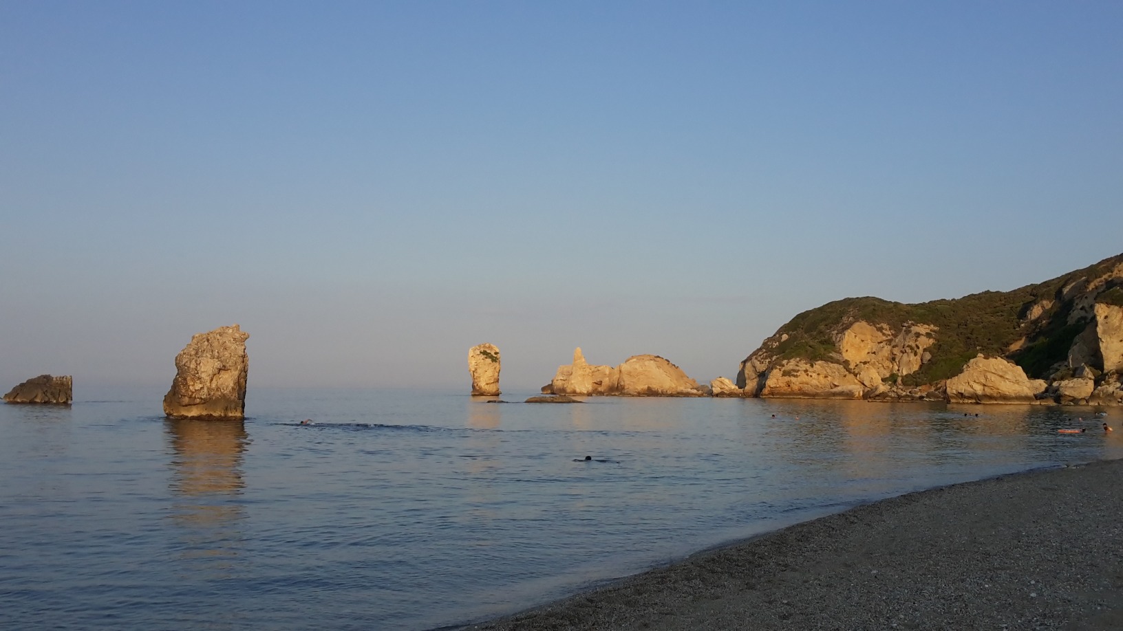 Paltsi with the lovely coast of yellow, green and white fine pebbles is magical when there’s no wind. The sea then is calm, and the setting is one of total tranquillity and there’s nothing better than dipping in the clear waters and then lying next to the sea. The amenities here are, thankfully, the bare minimum – just enough to cover the basic – leaving the beautiful scenery unspoilt. You’ll only find one tavern and a few rooms to let, all of them with gorgeous views of the beach. In the evening, the colour of the rocks that frame the beach turns orange as the setting sun reflects on them and the whole setting becomes magical.