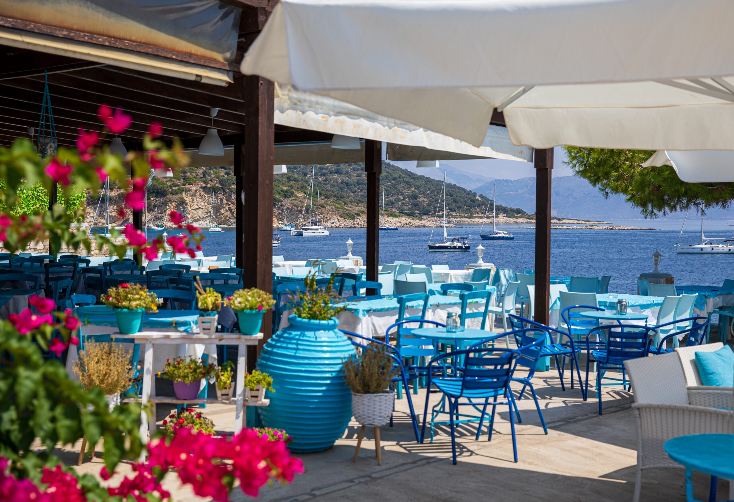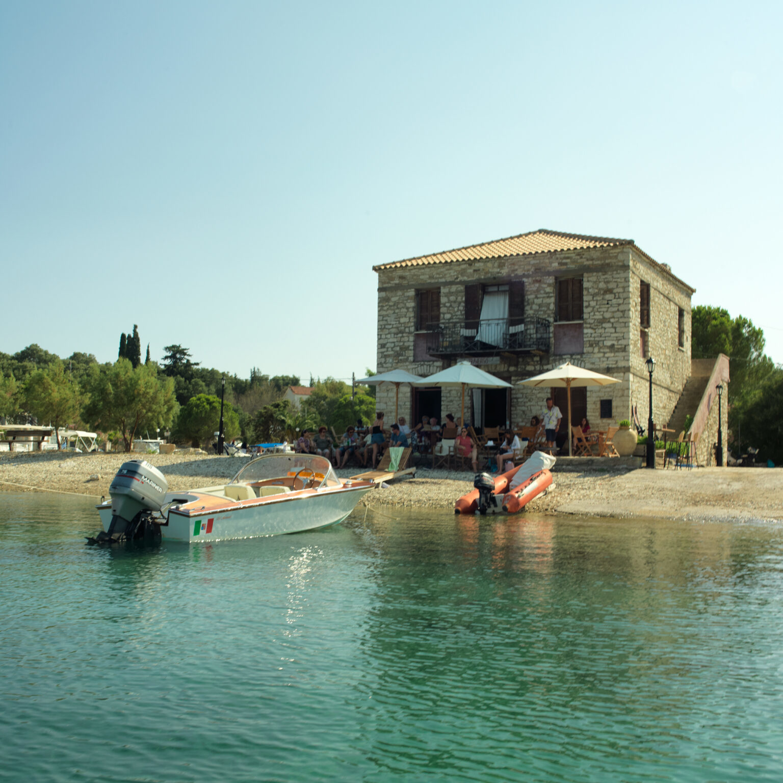 Following your swim, you may enjoy a meal at one of the island’s three tavernas and, in the evening, relax with a drink at one of three cafes. Outings on the island are mostly exploratory. Walk along small roads running through olive groves; head up to Pano Horio, the solitary settlement’s peak, featuring old stone houses, as well as an old windmill, standing like an abandoned attraction; reach Agios Aimilianos, a chapel above the beach of the same name; head up to Ai-Giannis Prodromos, a village church adorned with oil paintings by Lefkadian icon painter Spyros Gazis as well as a centuries-old olive tree, for a view of the harbour; and, generally, just enjoy the island’s tranquility and simplicity.