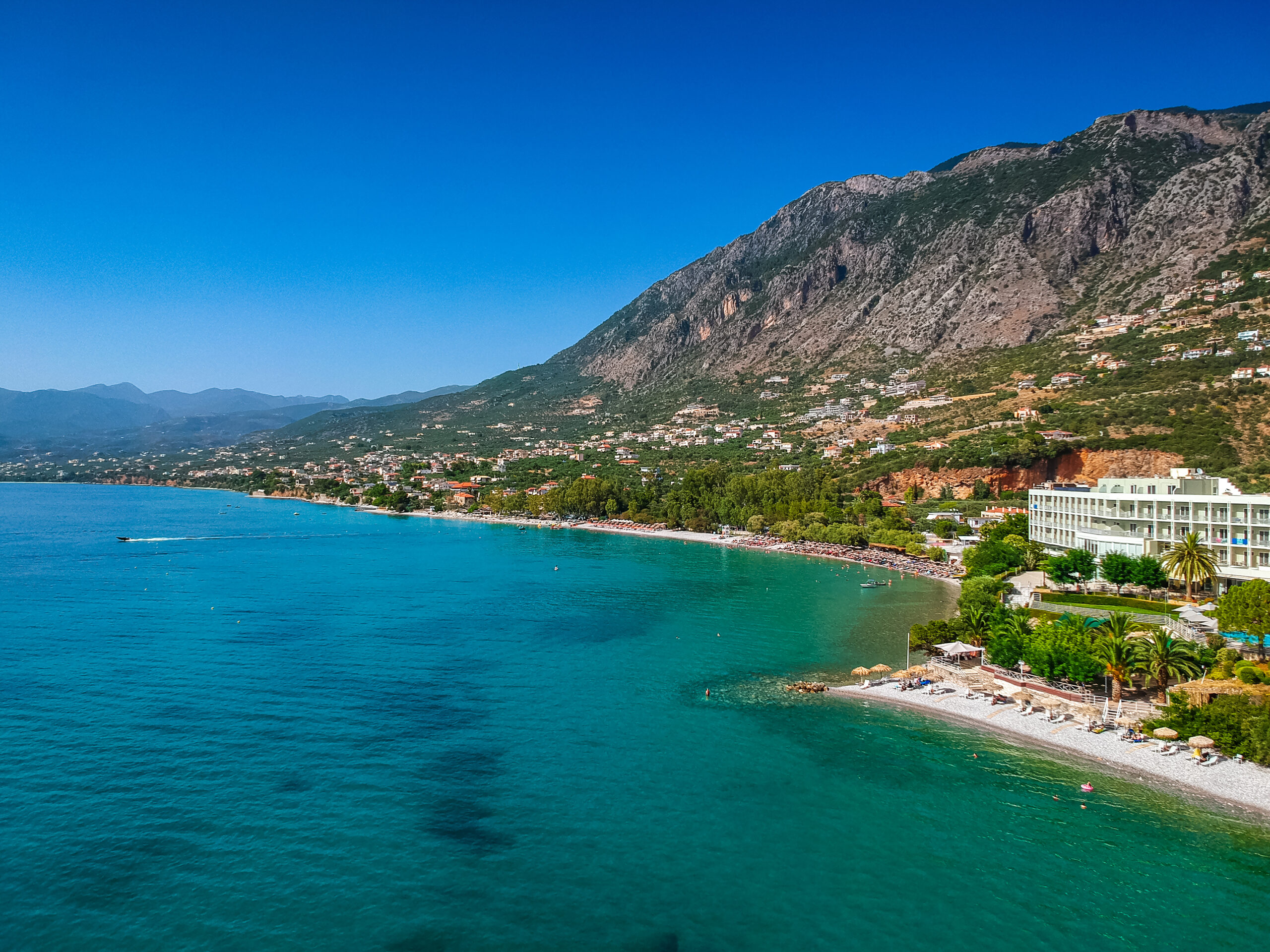 Mikri Mantinia, a magical pebbled beach located just 10 km from Kalamata, is an idyllic Blue Flag awarded destination where the majestic Taygetos mountain range meets the crystal-clear sea. The beach’s white pebbles and cool streams at the bottom of the sea make it a haven for visitors seeking respite on hot summer days.