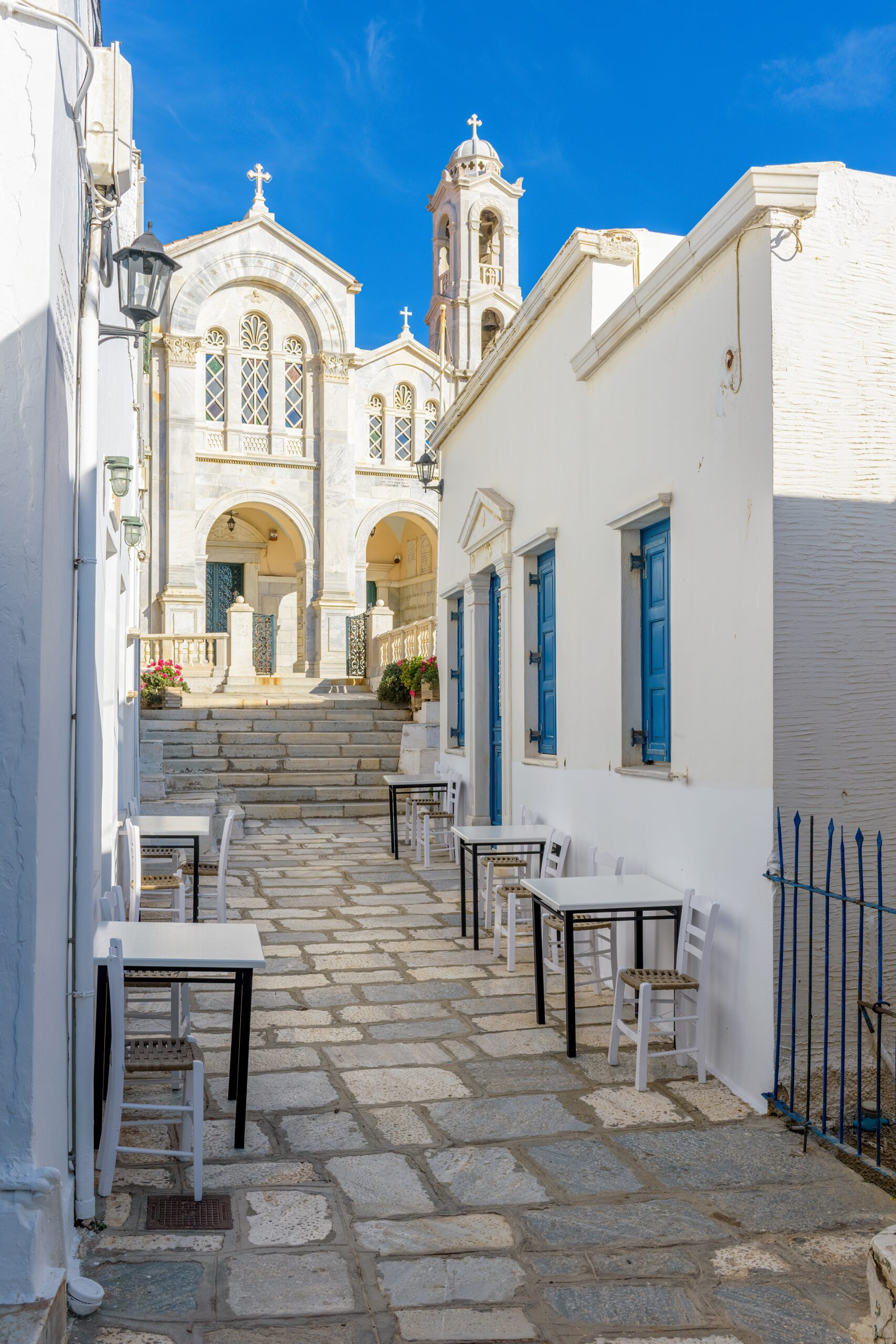 The village’s Cycladic two-storey mansions all feature intricately carved marble lintels, and many also showcase marble window frames. Delicate arches cast cooling shadows over the lime-washed narrow lanes, steep downhill streets seem to lead directly into the sea, and charming courtyards replete with vibrant bougainvillaea and robust geraniums command unparalleled views over Syros and beyond. On a clear day, other Cycladic islands to the west are visible on the horizon.