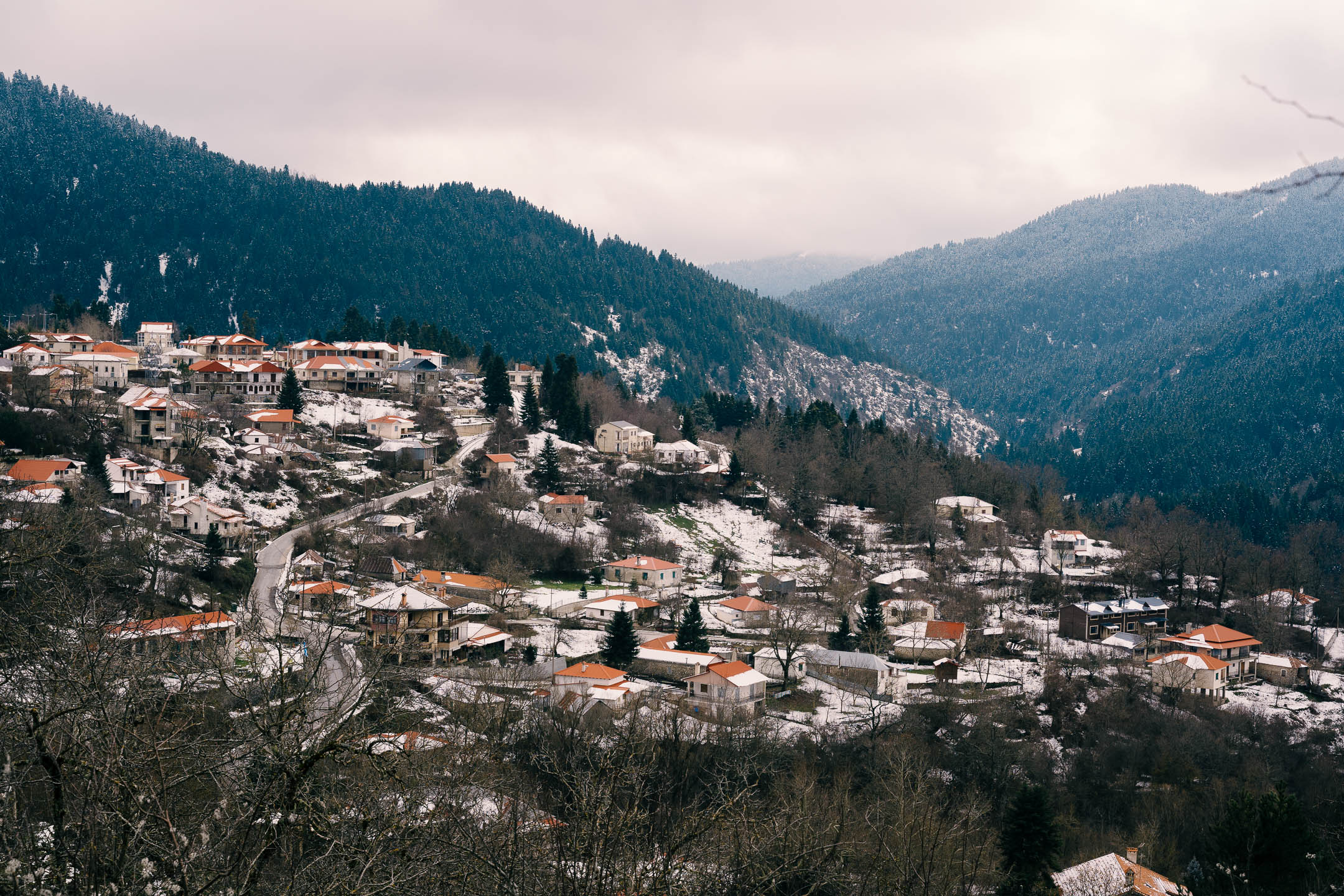 Shortly after the ski centre, at an intersection leading right to Chrisomilia, we choose to turn left to enter Pertouli, which is now dressed in snow. We enjoy the view of the settlement, as well as the route to Neraidohori. We turn onto a dirt road. Huge logs are lying on the right and left of the dirt road waiting to be transported. As we said earlier, several residents are involved in logging here, holding special permits and knowing what they can and cannot cut.