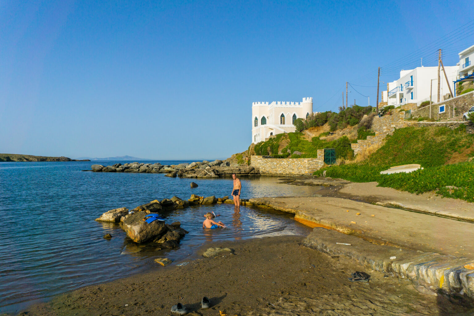 Spread across three coves on the northeast coast, Loutra is Kythnos’s busiest resort area. Cafés and restaurants sit shoulder to shoulder at the water’s edge; there’s a small marina, hotels, and rooms to let. Archaeological evidence suggests the thermal springs were used more systematically in Roman or Byzantine times. In the modern era, spa facilities were developed under King Otto. The Agioi Anargyroi spring runs at 40.5°C and is indicated for rheumatic, arthritic, and gynecological conditions. The second, Kakavos, runs hotter at 52°C—superheated, iron-rich, and open-flow; it empties straight into the sea near the cove, and people soak even on cold winter days.