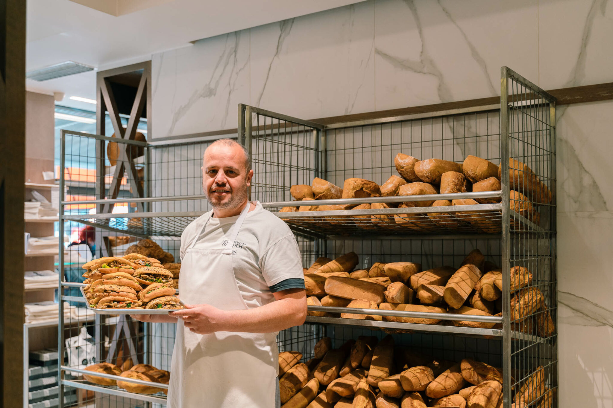A large team of bakers arrives at the bakery at around 4 o’clock in the morning and starts preparing the goods. We meet with them much later, when the displays are filled, and people are standing in line waiting to buy bread and pastries. We speak with Theodoros Natsikos, the baker in charge, who tells us about the bakery’s long history, that his father-in-law first opened forty years ago, but also tells us about the bakery’s present.