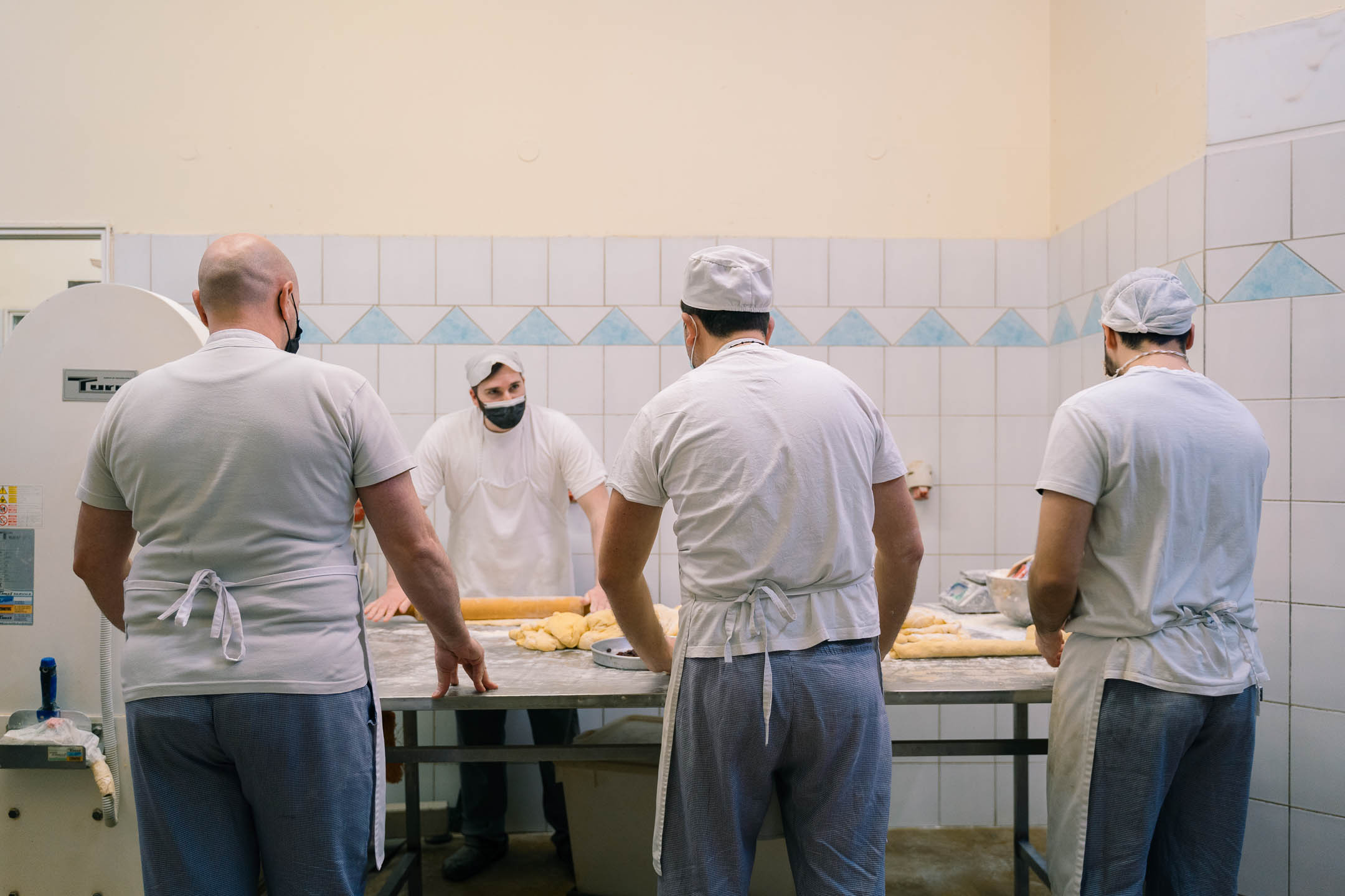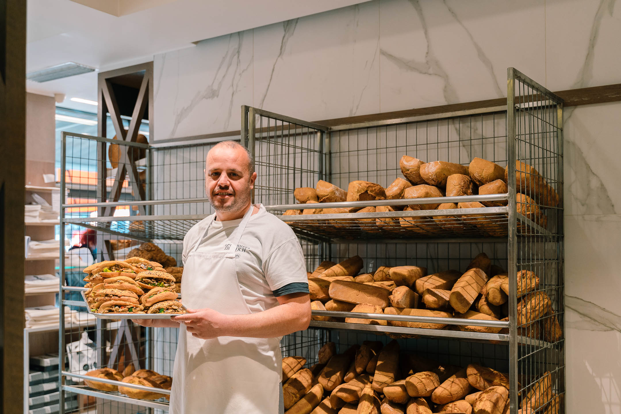 A large team of bakers arrives at the bakery at around 4 o’clock in the morning and starts preparing the goods. We meet with them much later, when the displays are filled, and people are standing in line waiting to buy bread and pastries. We speak with Theodoros Natsikos, the baker in charge, who tells us about the bakery’s long history, that his father-in-law first opened forty years ago, but also tells us about the bakery’s present.