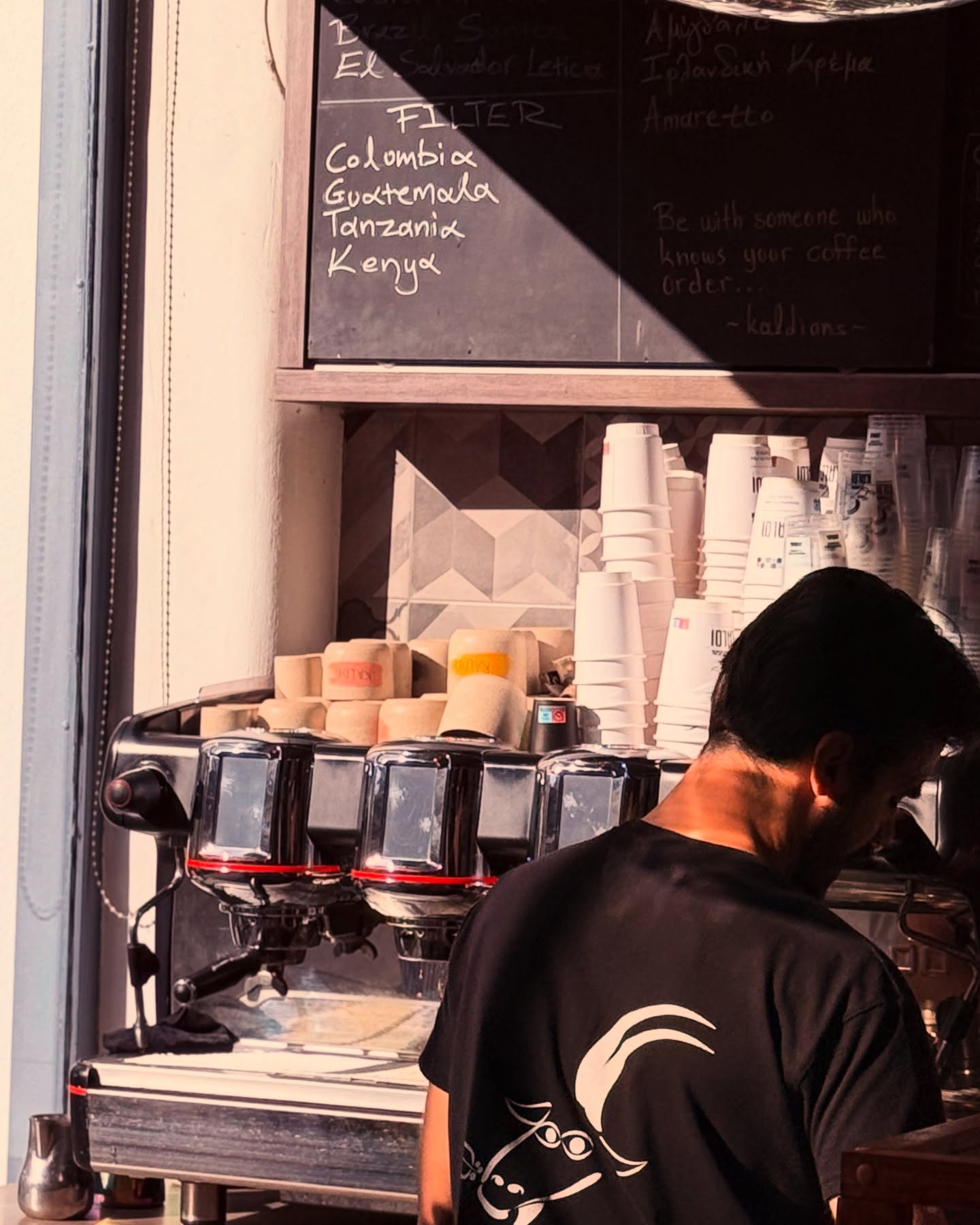 With its pared-back interior and art-minded details, Boken has quickly become a local favorite in Exarchia. Specialty coffee from European roasters anchors the menu, alongside matcha lattes and cinnamon rolls. The cozy loft upstairs doubles as an impromptu workspace, where regulars type away or read in peace. Its friendly, self-service rhythm and steady flow of locals give the café an unhurried charm, perfect for productive afternoons.