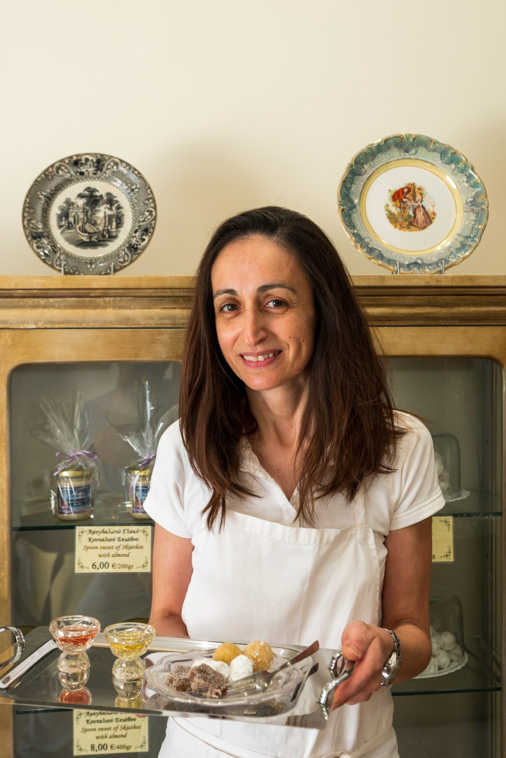 The small sweet shop opened in 2020 on Miaouli street, a street off the Papadiamantis main street that crosses the town. It’s name is a tribute to the author Alexandros Papadiamantis and is taken from his short story of the same name. As we approach, the fragrances wake our senses, while the traditional costume, right across the shop’s entrance, as well as the embroidered tablecloth on the table that holds sweets in crystal bowls set the tone. Gianna Konstantellou, the owner, offered us a lovely homemade liquor and told us: