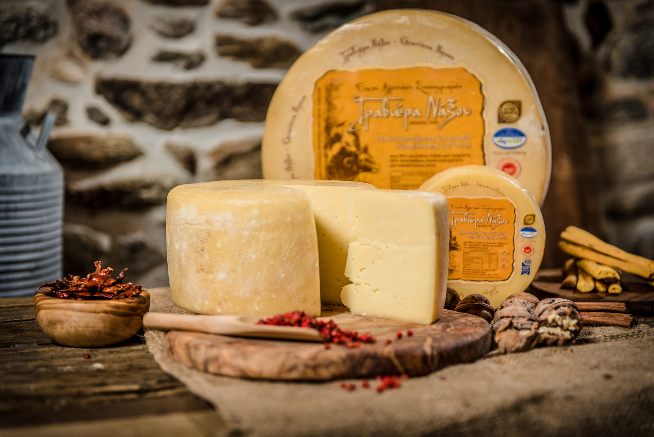 Graviera Naxou is a cheese that has a taste synonymous with the island of Naxos. It is made from 80% sheep’s milk and 20% goat’s milk, and ages for at least 3 months. It is a cheese with excellent balance between piquant, salty and sweet flavours. When it ages for more than 12 months, it becomes extremely complex and resembles certain types of parmesan. In Naxos, it is often aged in cellars with aromatic herbs for up to 2 years, turning it into a delicious surprise. Graviera Naxou is a cheese that embodies the centuries-old cheese-making tradition at the heart of the Cyclades, and pairs perfectly with any type of dish. A few pieces of aged Graviera Naxou are a great accompaniment to red wines. Sandwiches with Graviera, thin slices of quince and a bit of mustard are a completely irresistible breakfast option. As a topping for salads, it adds taste and substance, while in savoury pastries it elevates them to a new level. It is an essential ingredient in many traditional dishes such as pastitsio and mousaka.