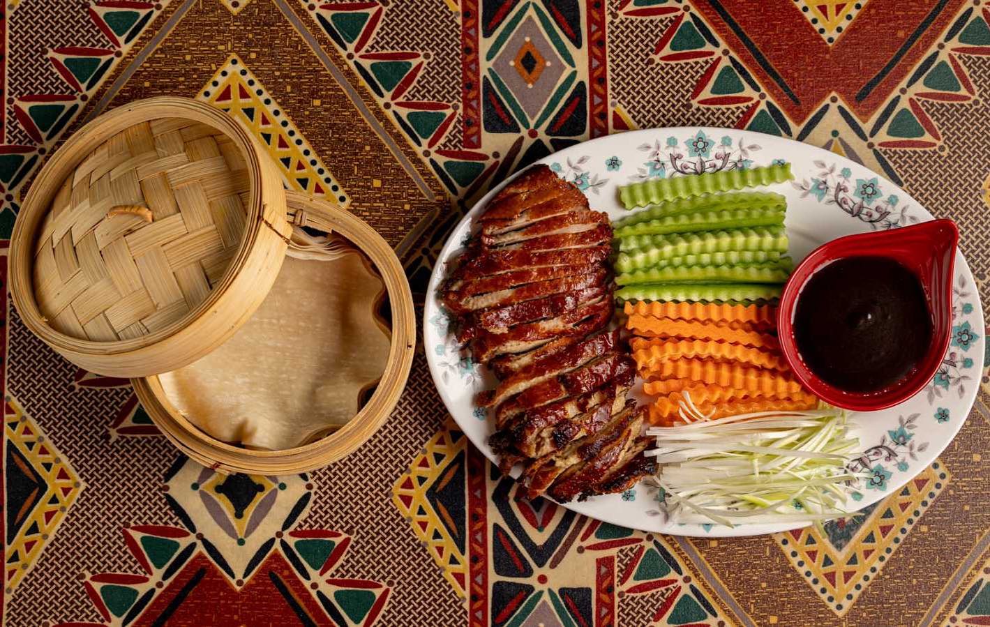 - Spicy Duck Salad, smoked duck fillet with green beans, peppers, cucumber, fresh coriander, onion and lime.