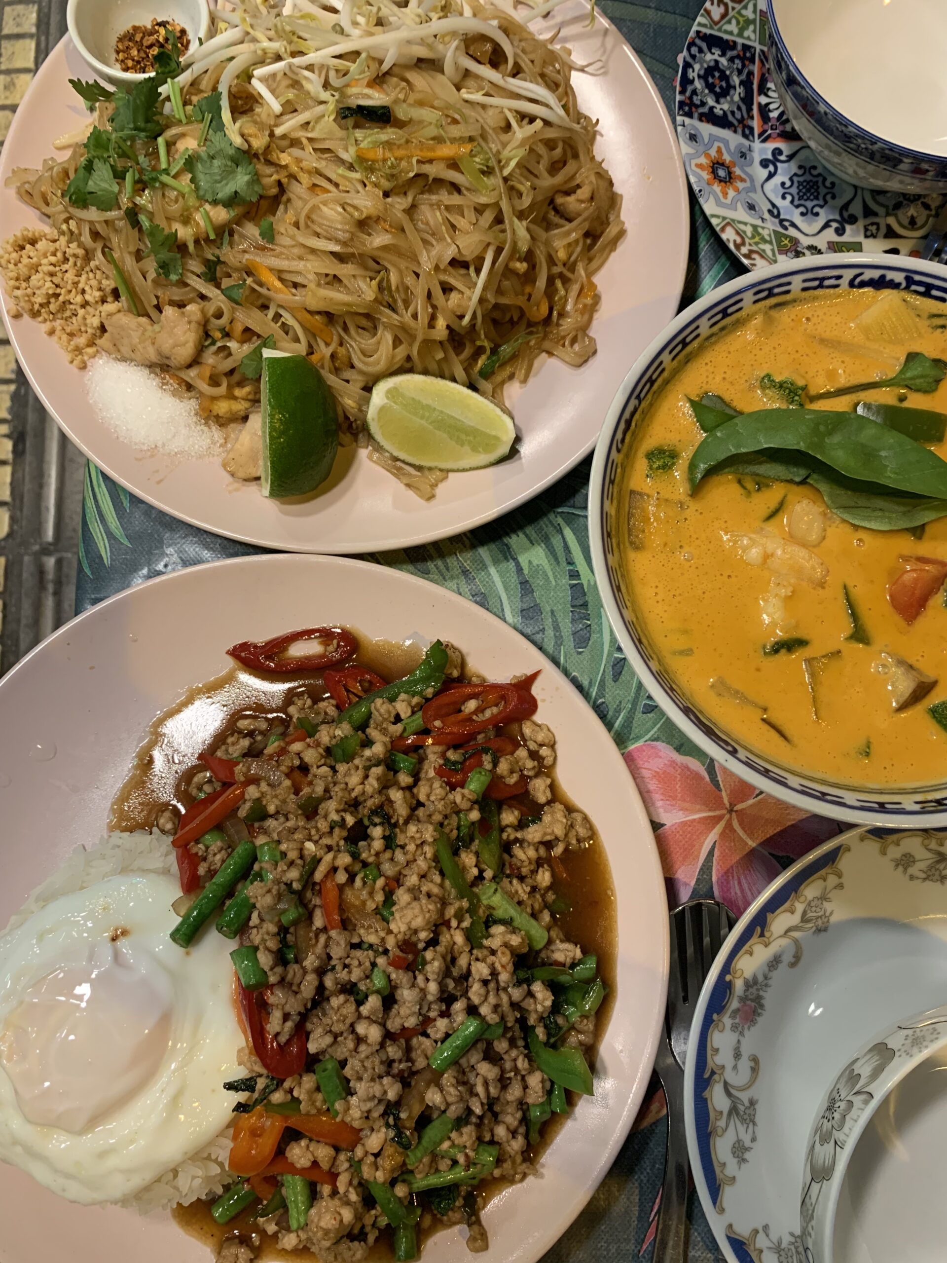 - Thai Basil, fresh vegetables sautéed in a wok with basil, chili and soya sauce, served either with chicken or prawns, plus rice.
