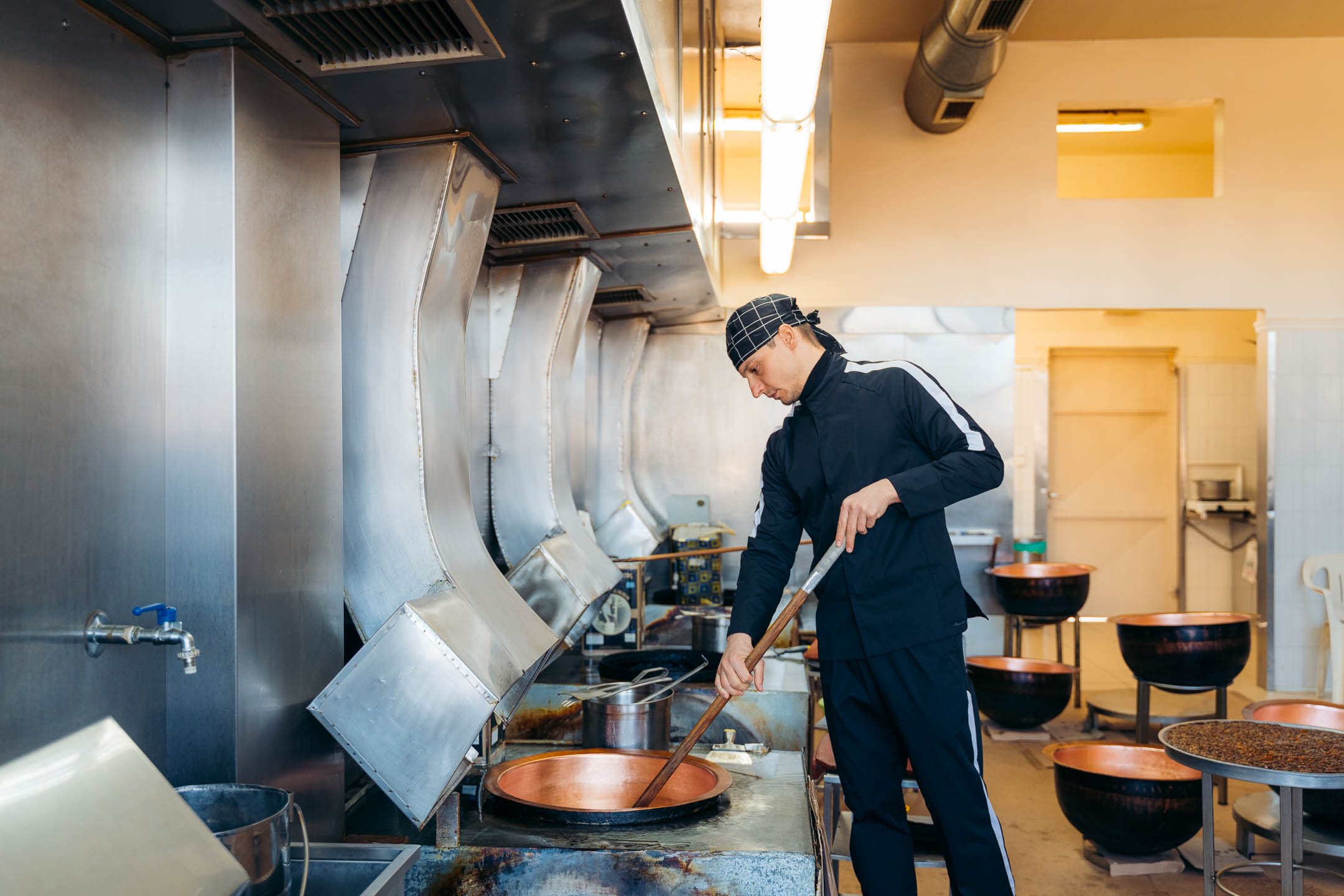 He adds water and sugar to the copper pot and as the temperature rises, he stirs to make syrup. He then adds butter and cornstarch, continues to stir and the mixture begins to thicken. Meanwhile, as it blends with the butter and takes on that ruby red colour, the room is already filled with aromas. Depending on the version, you can add almonds or other nuts. We leave the workshop and the aromas do not fade; a warm piece of halva is waiting for us to taste it.