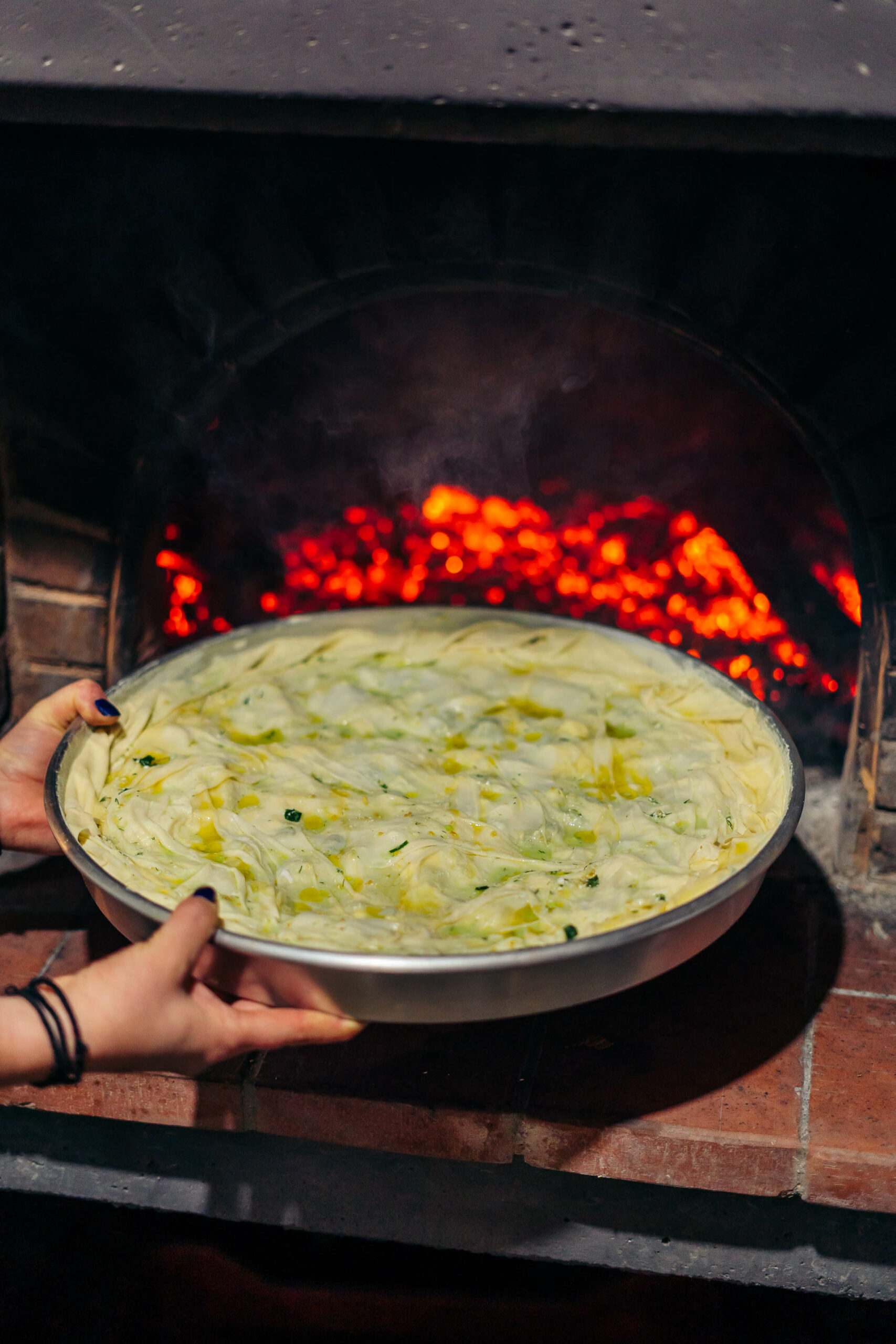 Baking pies in Arados restaurant’s wood-fired oven in Agios Dimitrios, Kalambaka