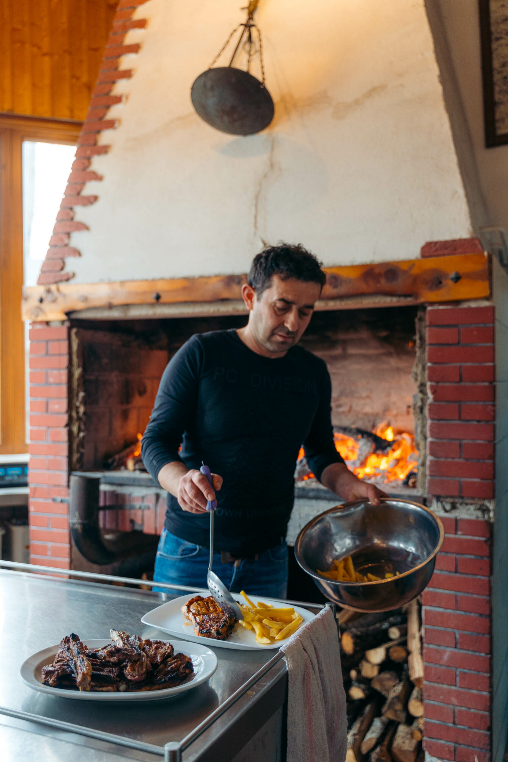 We arrived in Gousios on a Thursday afternoon. The sun was shining, but it was still freezing. A huge fire was humming in the fireplace and another by the grill. The table was set and apart from everything else I can’t help but mention first of all the lamb chops and sausages they produce, curing in the cold air in the butcher’s area next to the tavern. Mrs Maria is in the kitchen making pies, fresh salads, boiled greens, spetsofai (spicy Greek sausages with peppers and tomato sauce) and probably some of the most delicious fries we have ever tasted.
