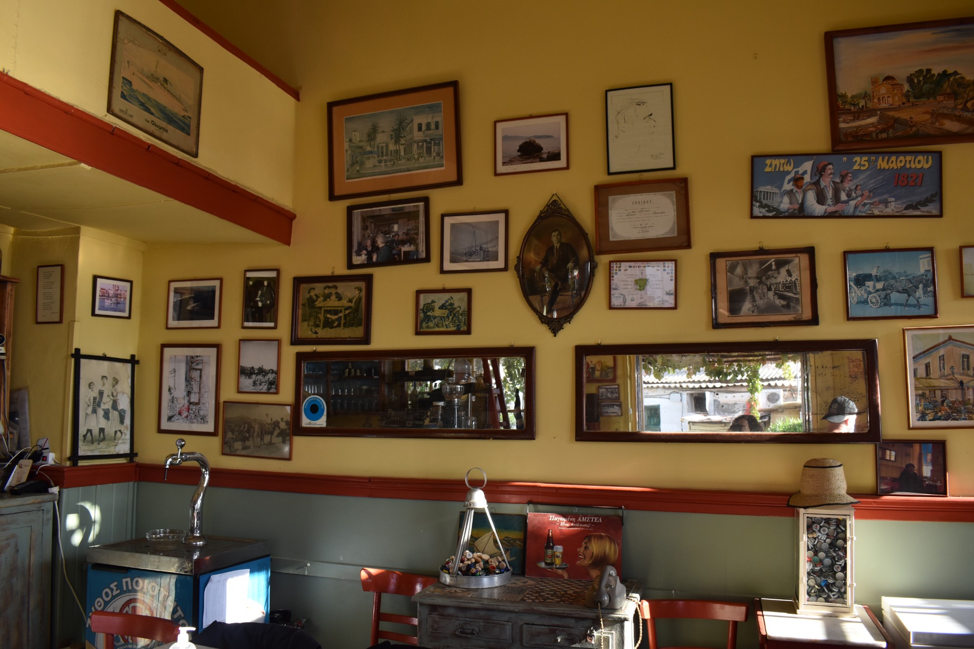 Grab a table outside to be able to see Dimokratias Avenue and the dock with the fish boats, or if it’s cold, get a table inside the small interiors with the walls full of stories in the form of framed black and white photos, old posters and newspaper clippings about the two coffee shops. Coffee is served with a spoon sweet, ouzo with the bare essentials, but the essence here is history and authenticity.
