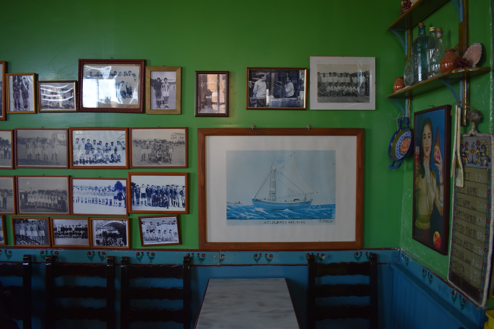 Before your main meal, to sharpen your appetite, go for an ouzo with a meze. To be honest, even just a simple Greek coffee prepared in a briki (the special pot) is enough excuse to visit the beautiful – almost twin – kafenia (coffeeshops), standing next to each other and in operation for almost 60 years. A stone’s throw from the fish market and right across the vegetable stalls on the pier, underneath the elaborate balcony of the historic building that used to house the town hall, you’ll become one with the locals and the tourists, laid back youths and elders always willing to share stories from the past. Anastasia Galaris’ coffeeshop is bright red, Kostas Moiras’ coffeeshop bright green. There’s no rivalry between them, both exude a strong nostalgic chic vibe, both are simple and elegant, freshly painted but with apparent marks of the passage of time, they share a history and their clientele.
