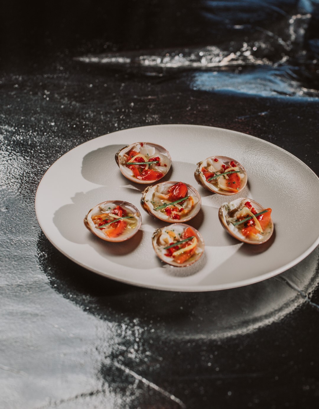 Vezenes’ unique way of grilling is enhanced by special tools like smoking mesh tubes that replace the cooking torch, while at the same time various other dishes are being slow cooked in pots; trahanotos (the Greek version of a risotto, made with tarhana, a wheat based dried food ingredient) soften; spaghettis and giouvetsis (Greek dish with meat and orzo pasta) are being prepared in pans; all of them placed in different heights over the fire. Flat breads, aubergines, eels, octopuses, and beef are baked in the wood-fired oven and broths are smoked, while Greek crudo seasoned with lemon, olive oil, mint, fennel instead of soya, mirin, ginger, as well as some of the “Vezenes” popular dishes like sea-urchin pasta, beef pasticcio tartar and steamed clams in assyrtiko wine all complete the menu. “Everything is prepared on the fire, and if we get a power outage, we can still cook everything here,” he clarifies with pride.