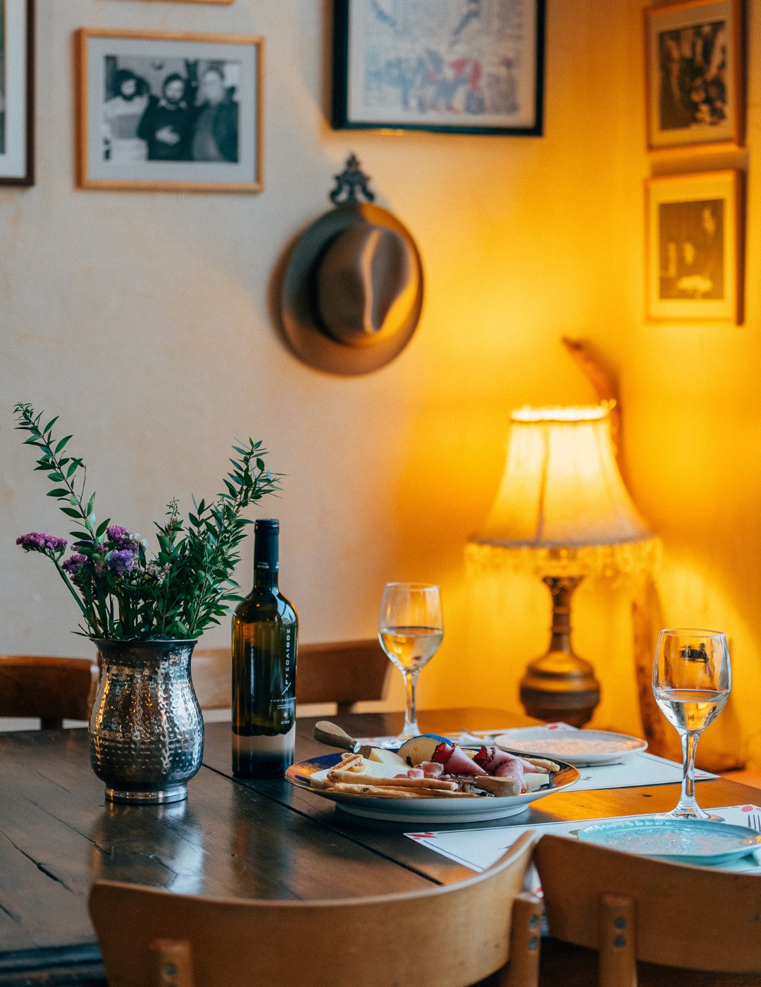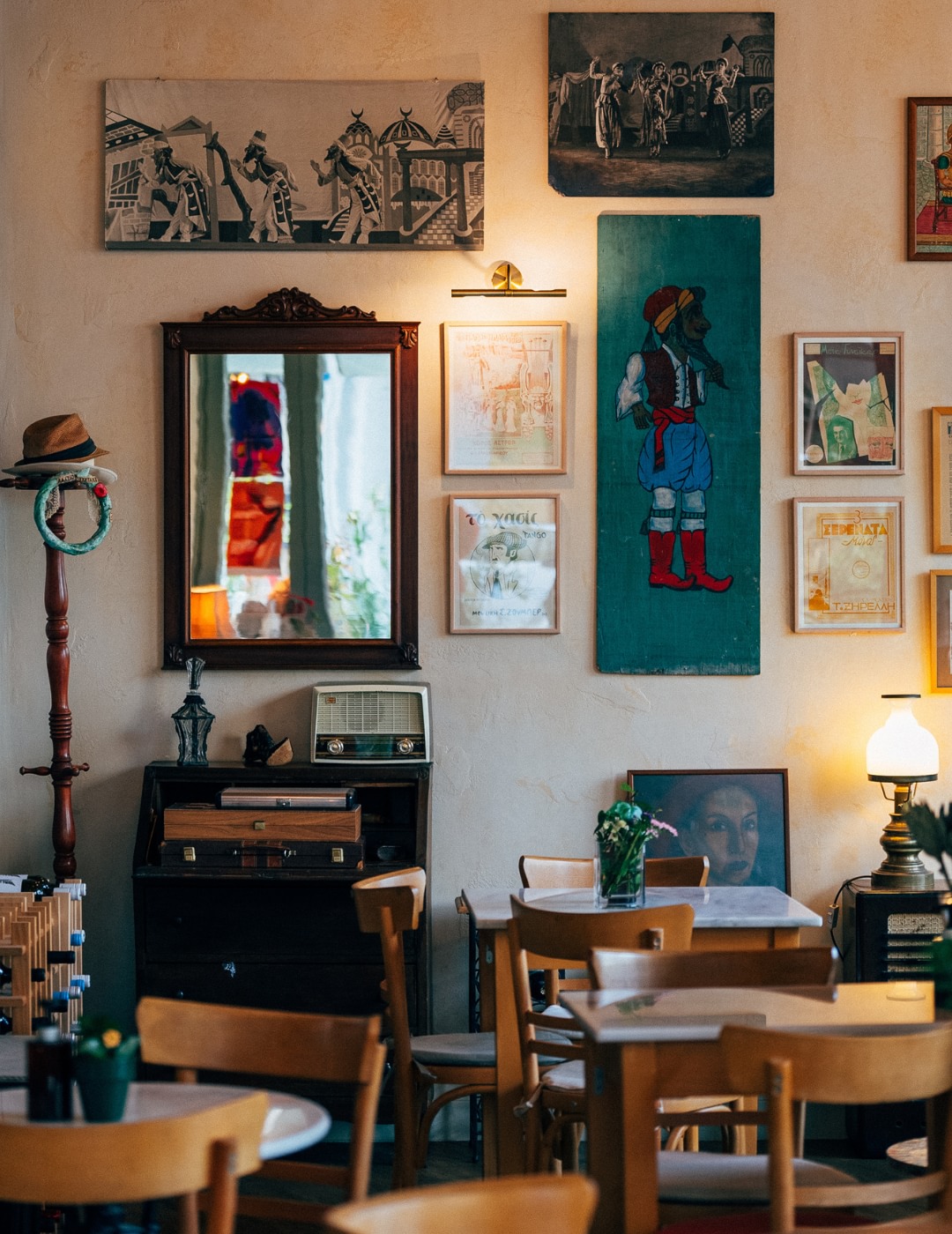 An urban café in the 1930’s thrived under the guidance of George Rizos, a place where men would meet and play backgammon while the Acropolis loomed overhead, their cigarette smoke staining the ornate plaster ceiling. Skip forward some decades to the modern era and Michalis Rizos, unrelated owner of the much-loved Black Duck on Klathmonos Square, took over the lease of the now abandoned building on Akamantos Street . Unaware of its previous history and title, research confirmed its former owner and it was decided to recreate the identity and name of its previous iteration. Works of art from iconic Greek artists adorn the walls, marble tables remind of its former life and the high-ceilinged room has been restored to its former glory with the old sign bearing the Rizos moniker taking pride of place once again on the lovingly-renovated building.