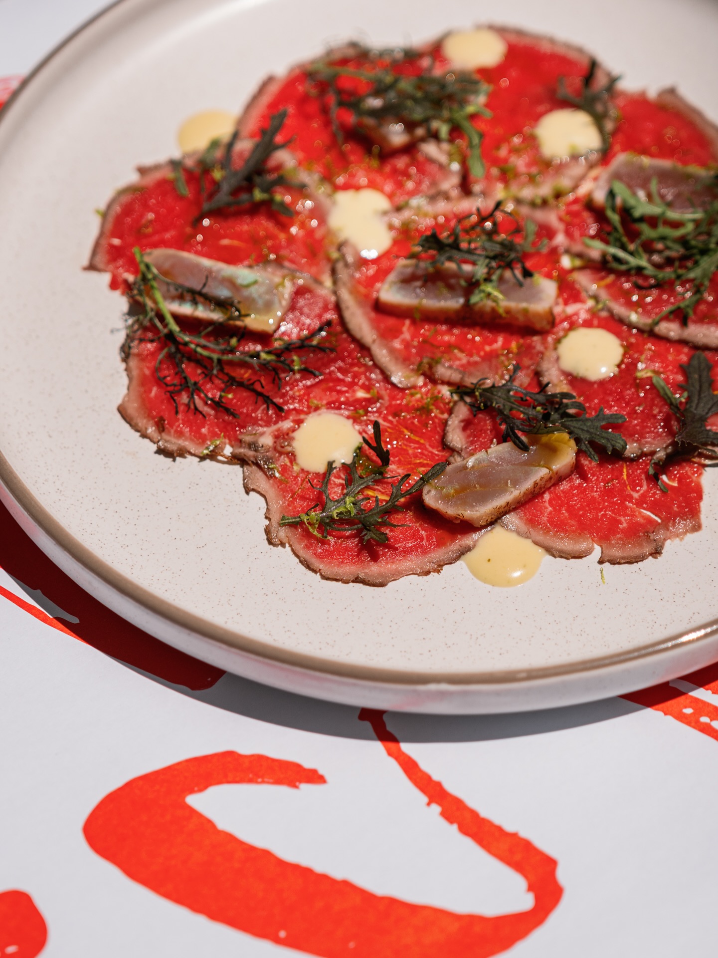 The room brings together elements associated with Kolonaki over time, combining clean lines with older architectural details and a layout that encourages lingering rather than quick turnover. Food is served throughout the day and evening, built around a small menu designed for sharing. Dishes such as burrata with tomatoes and carob rusk, sea bass ceviche with leche de tigre, and eggs with stakovoutyro and truffle appear regularly, alongside a pastrami sandwich ordered well into the afternoon. The drinks list balances wine and cocktails, with an emphasis on versatility rather than volume.